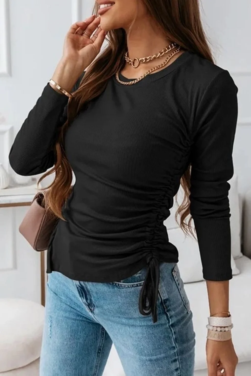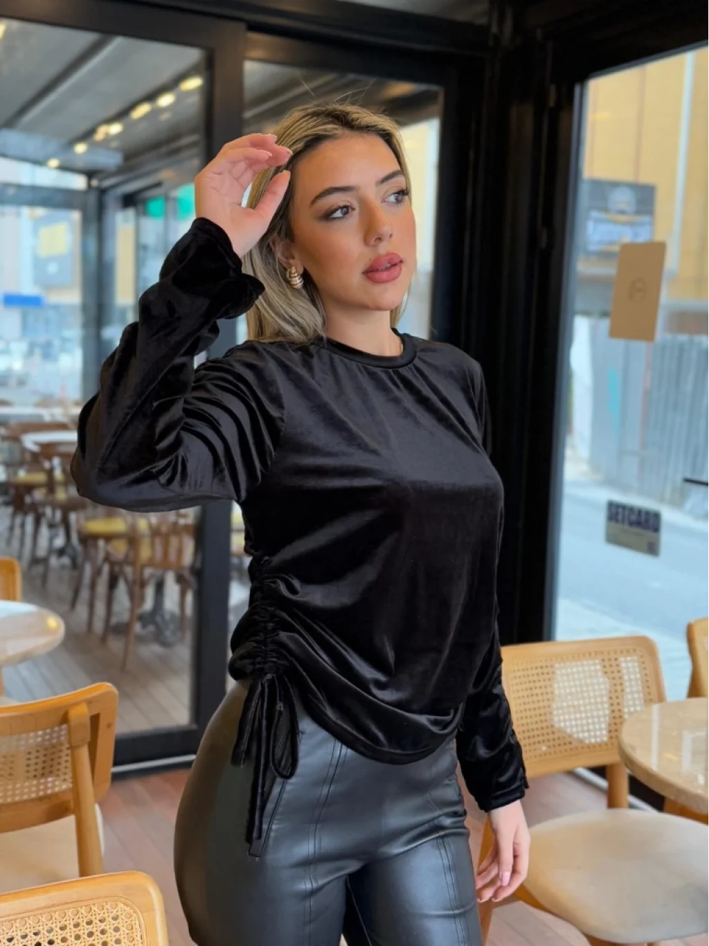 Kadın Uzun Kollu Bisiklet Yaka Yanları Ve Kolları Büzgülü Kadife Bluz
