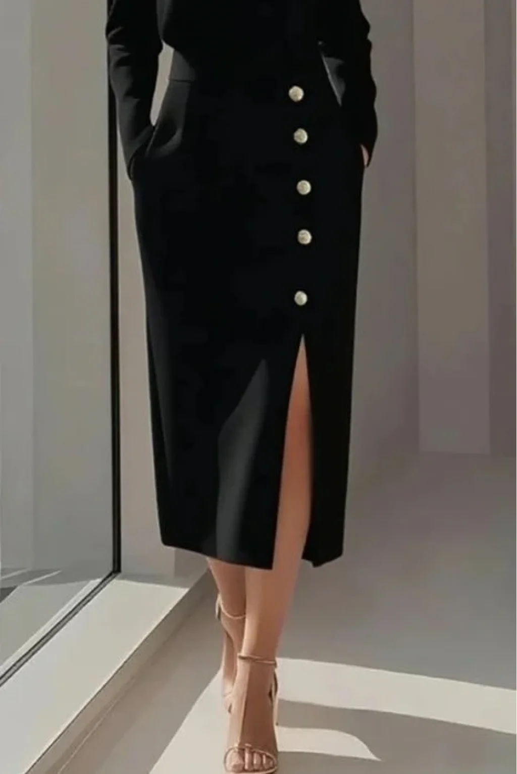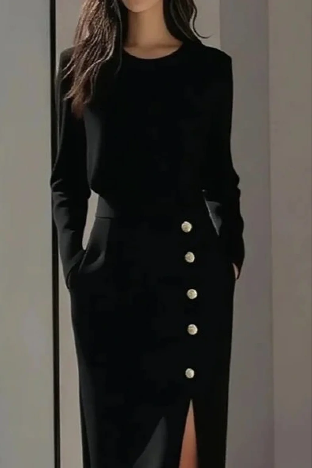 Kadın Uzun Kollu Bisiklet Yakalı Yandan Yırtmaçlı Düğmeli Midi Ithal Krep Elbise