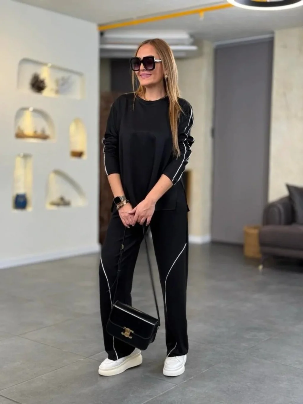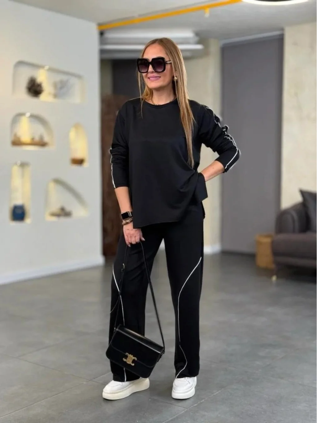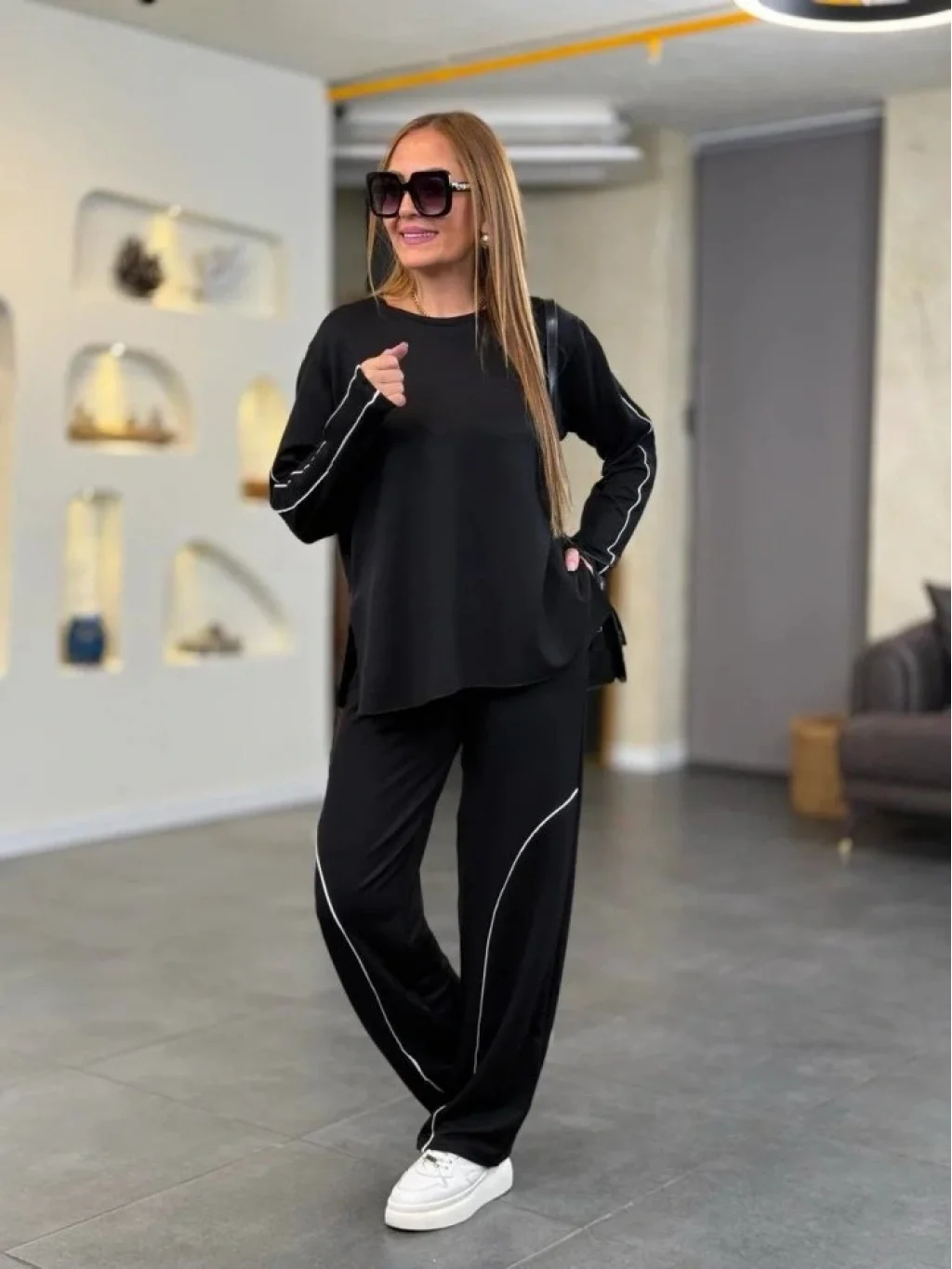 Kadın Uzun Kollu Biye Detay Modal Kumaş Salaş Ikili Takım