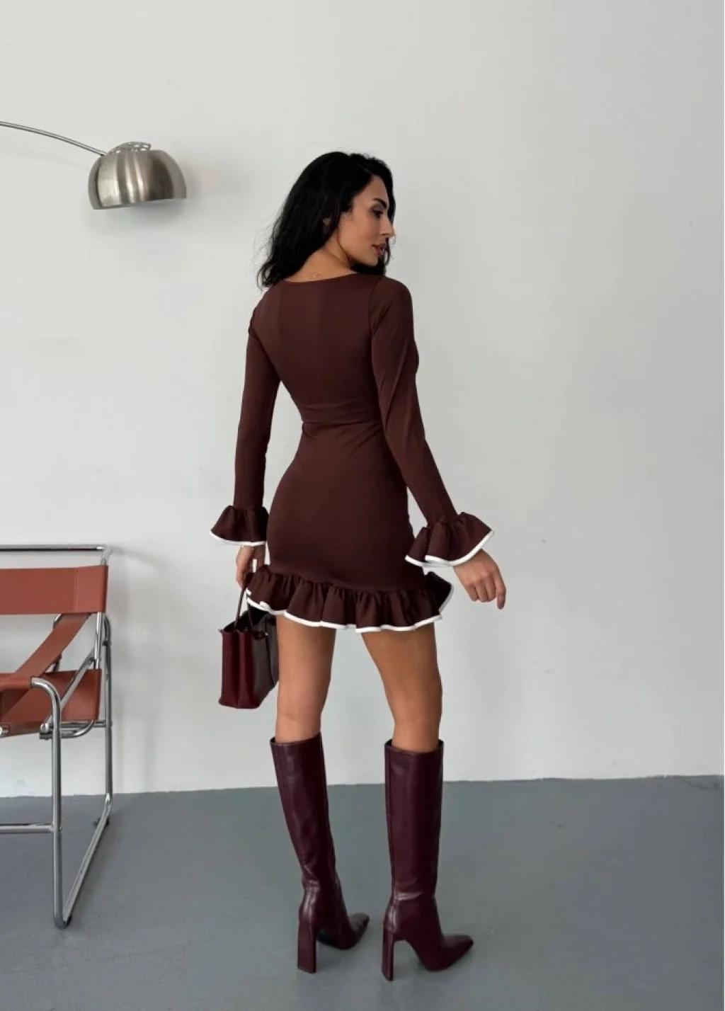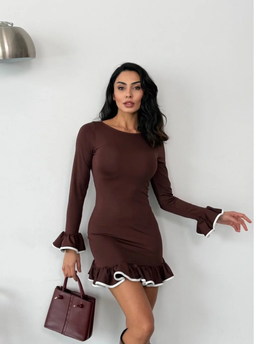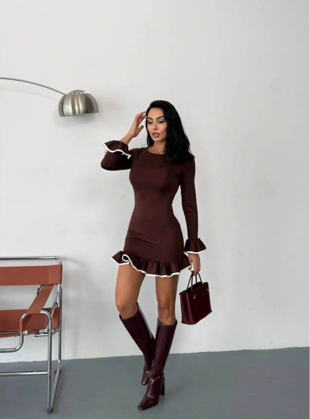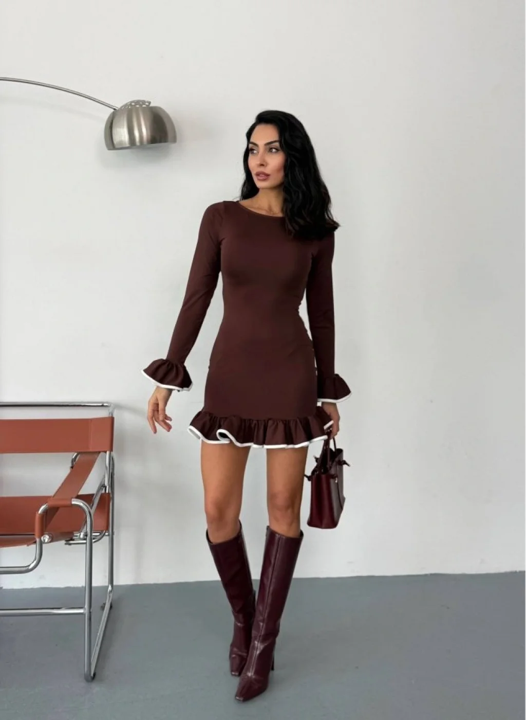 Kadın Uzun Kollu Biye Ve Volan Detaylı Dalgıç Kumaş Mini Elbise