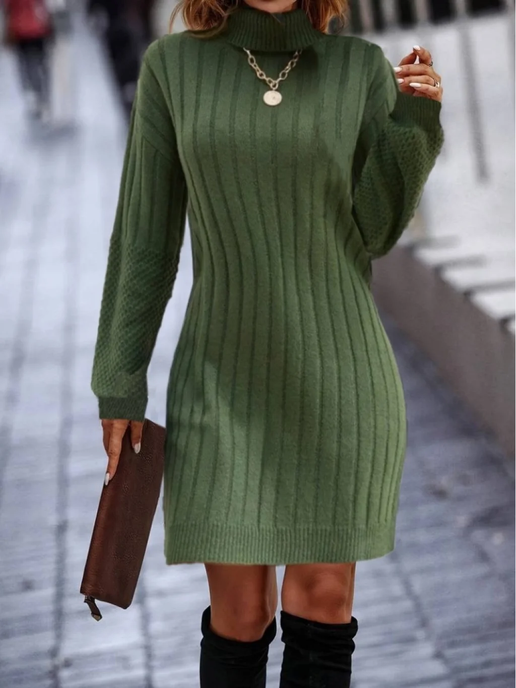 Kadın Uzun Kollu Boğazlı Uzun Balon Kol Triko Mini Elbise