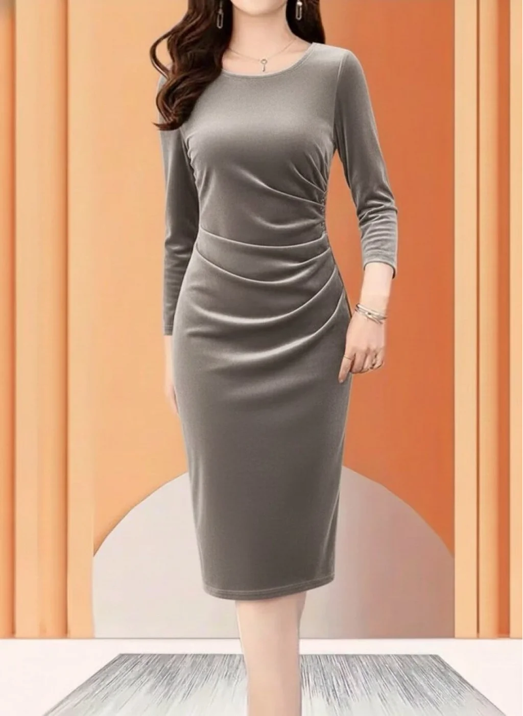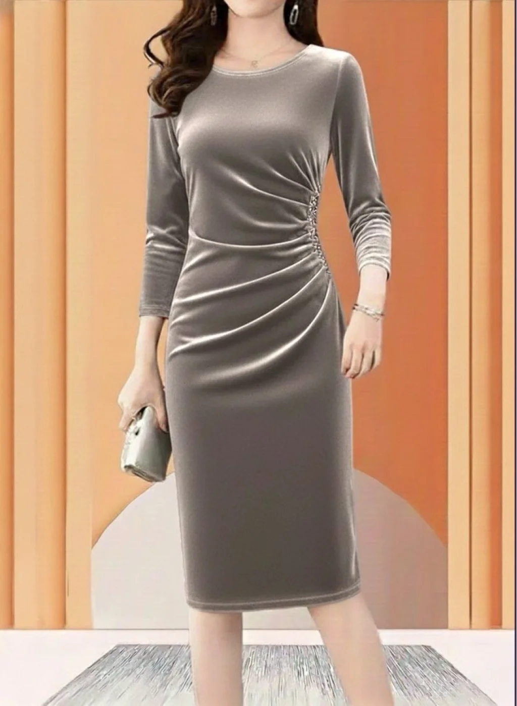 Kadın Uzun Kollu Bot Yaka Yanı Taş Detaylı Midi Kadife Elbise
