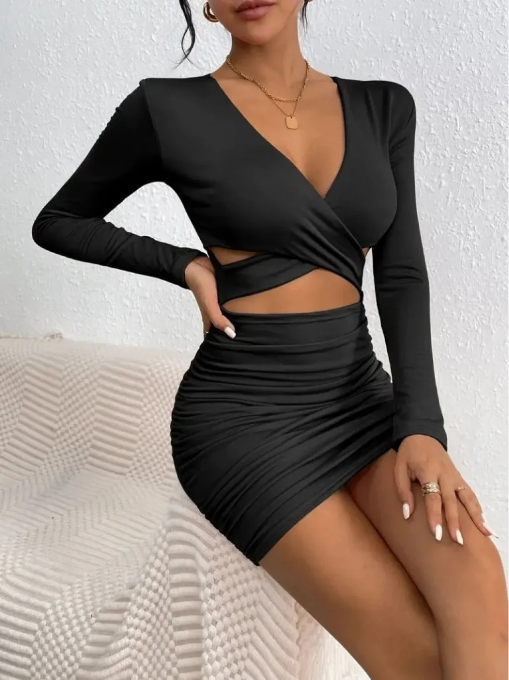 Kadın Uzun Kollu çapraz Dekolte Detaylı Mini Sandy Elbise