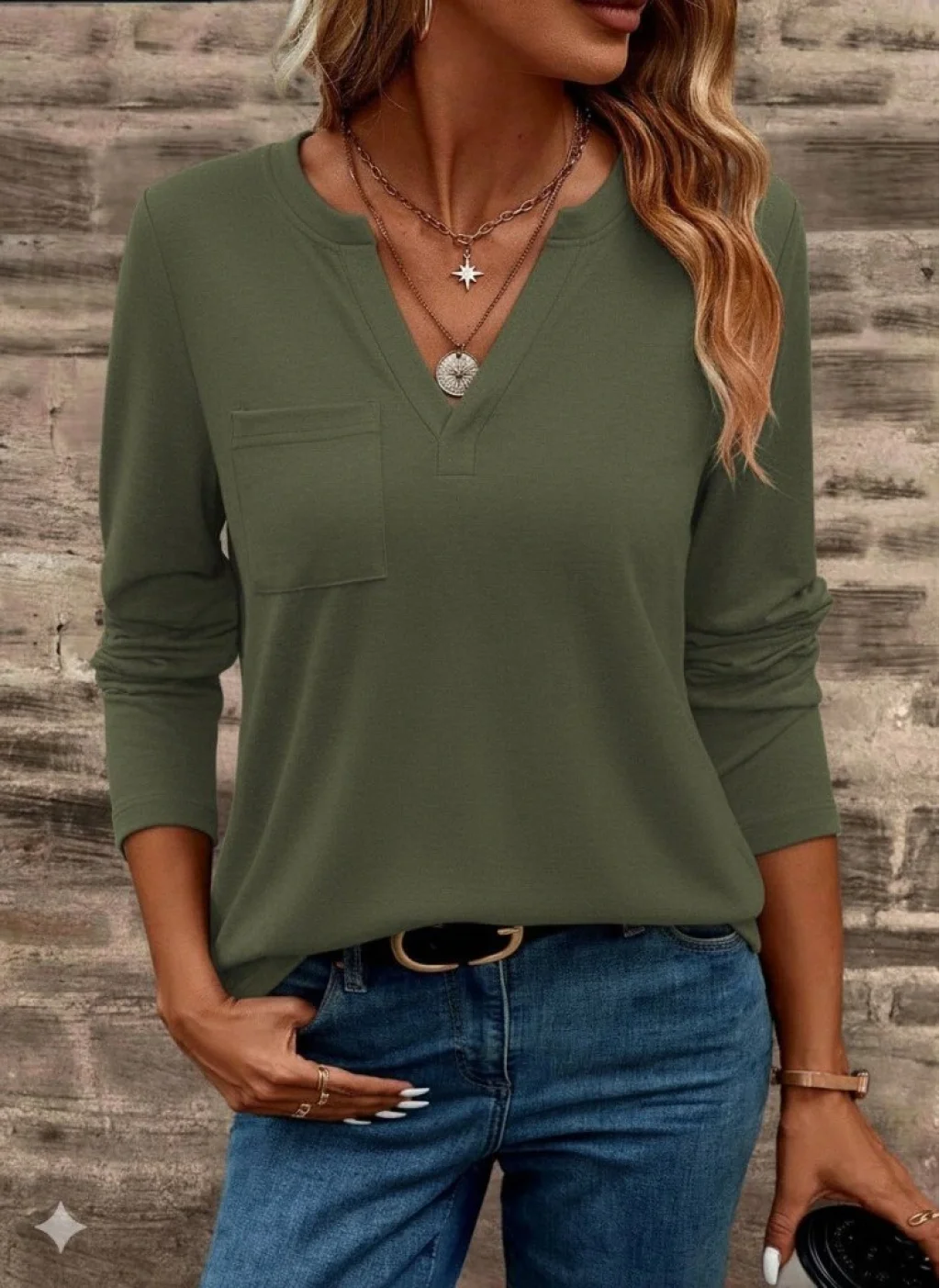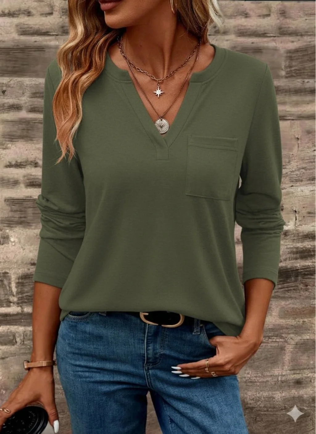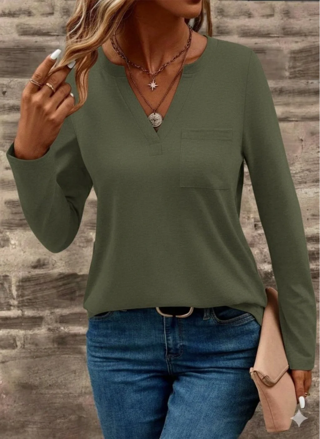 Kadın Uzun Kollu Cepli V Yakalı Viskon Iki Iplik Bluz