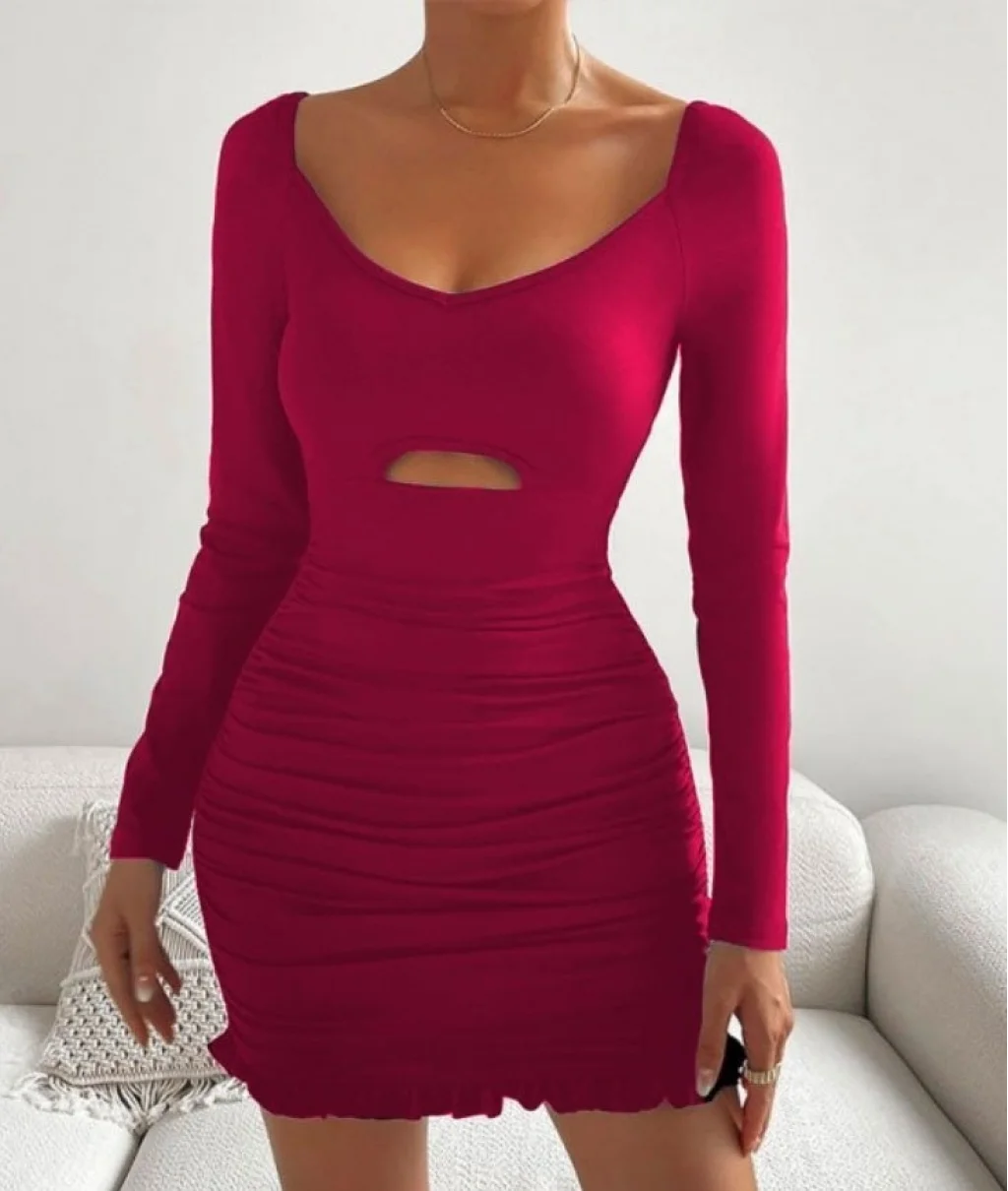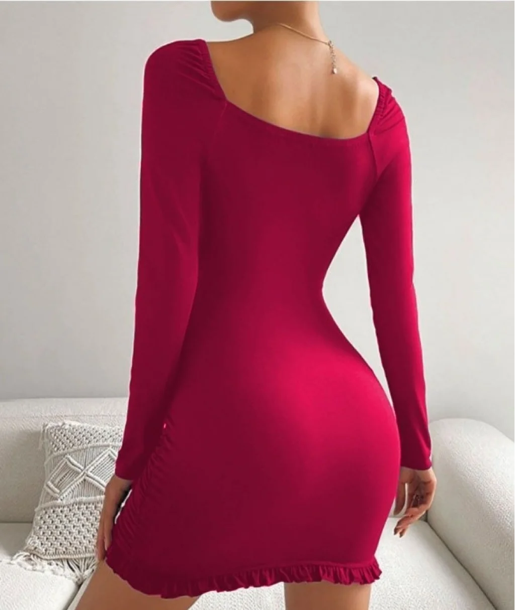 Kadın Uzun Kollu Derin V Yaka Göğüs Altı Dekolte Detay Etek Ucu Fırfırlı Sandy Mini Boy Elbise