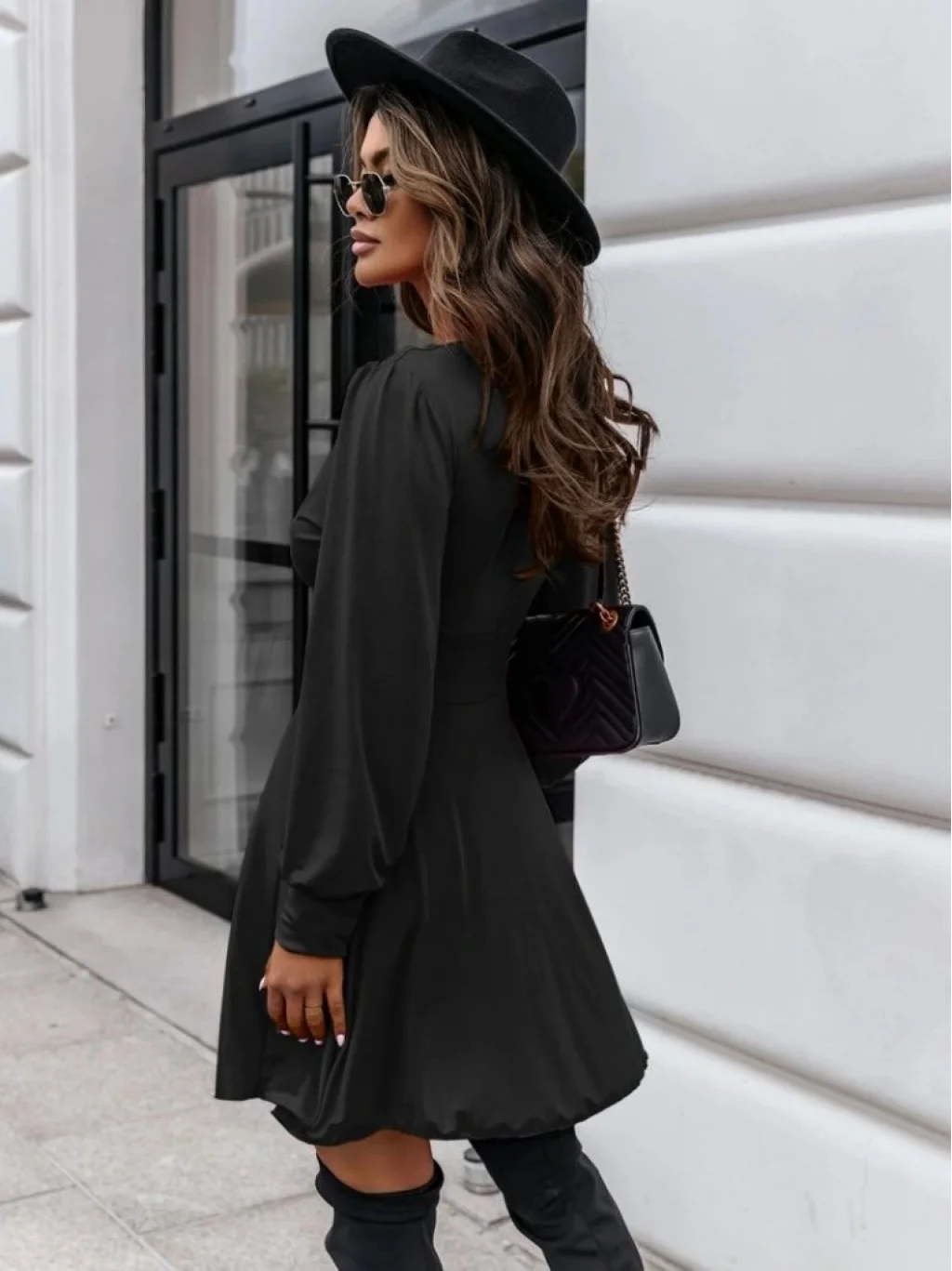Kadın Uzun Kollu Derin V Yaka Göğüs Altı Dekolte Detaylı Sandy Mini Boy Elbise