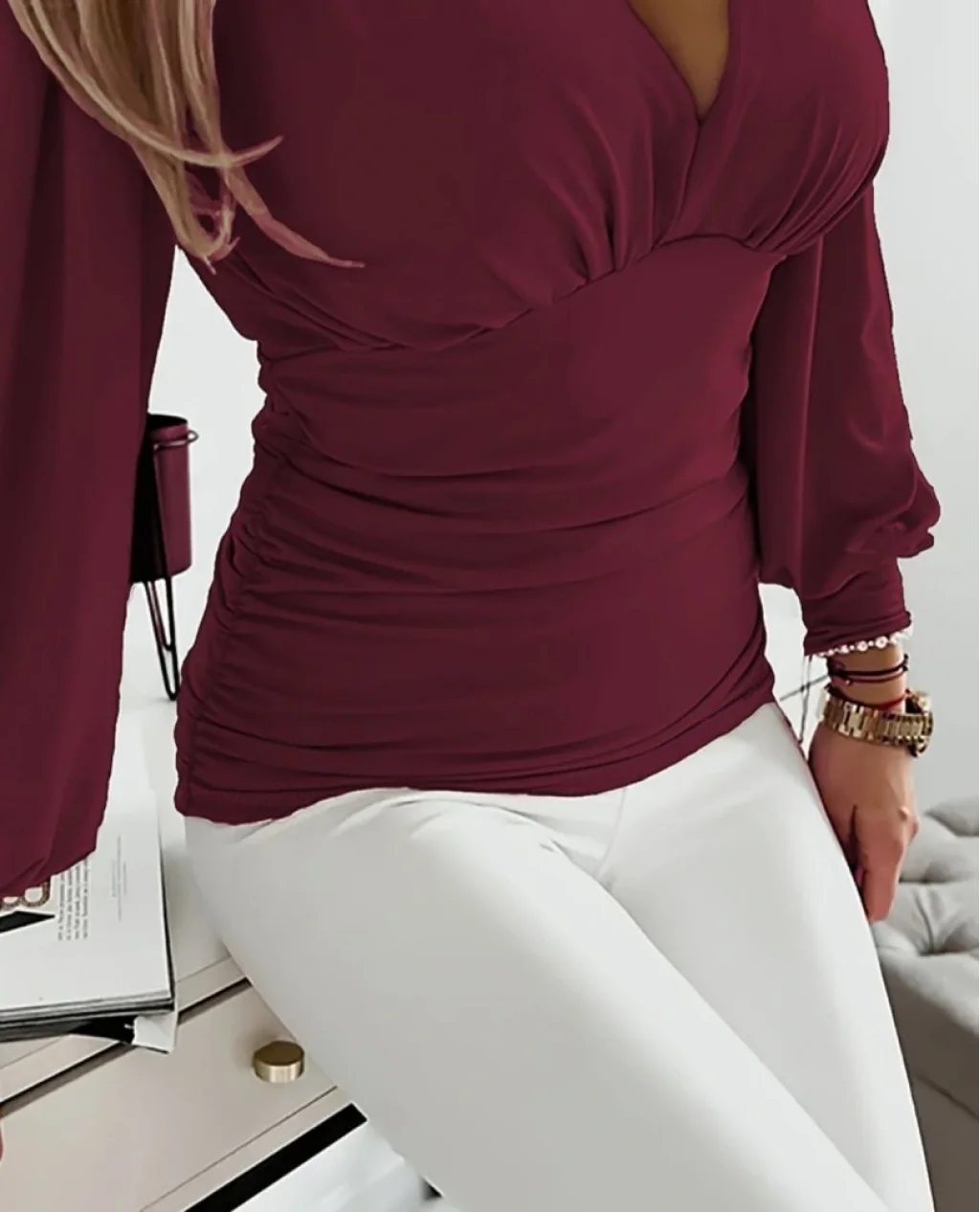 Kadın Uzun Kollu Derin V Yakalı önden Büzgülü Sandy Bluz
