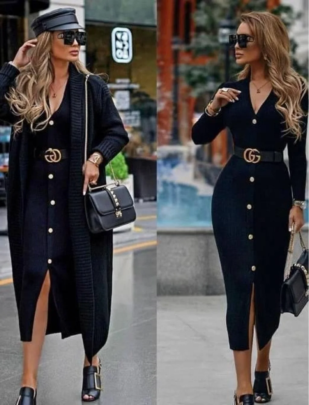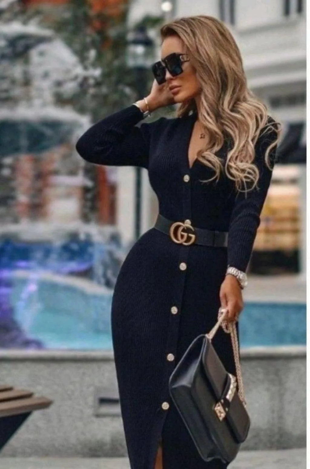 Kadın Uzun Kollu Düğme Detay örme Kaşkorse Kumaş Kemer Dahil Maxi Boy Elbise