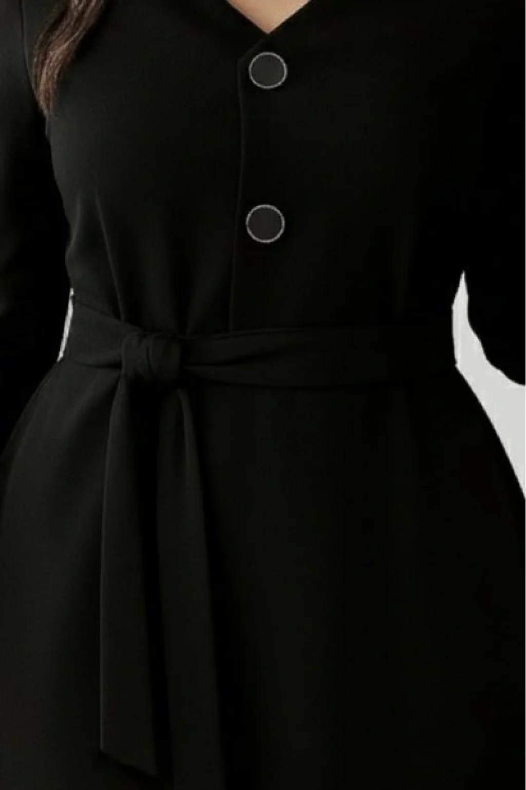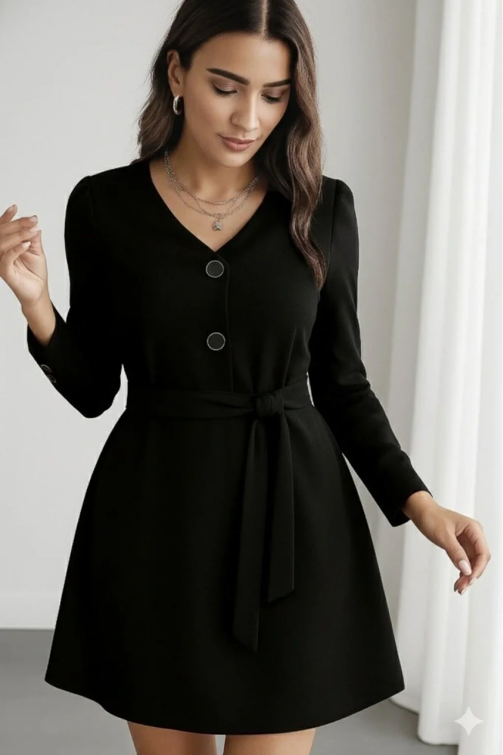 Kadın Uzun Kollu Düğme Detaylı Kendinden Kemerli Ithal Krep Elbise