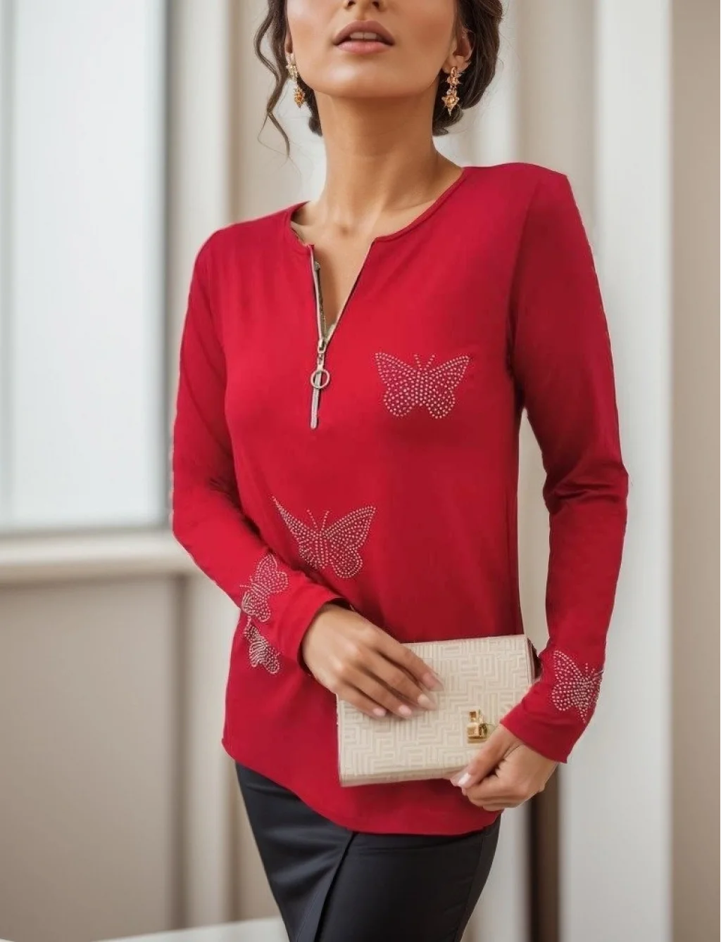Kadın Uzun Kollu Fermuar Detaylı Kelebek Taşlı Desen Viskon Bluz