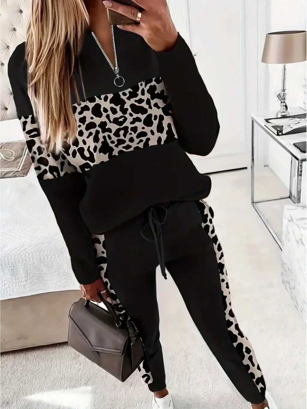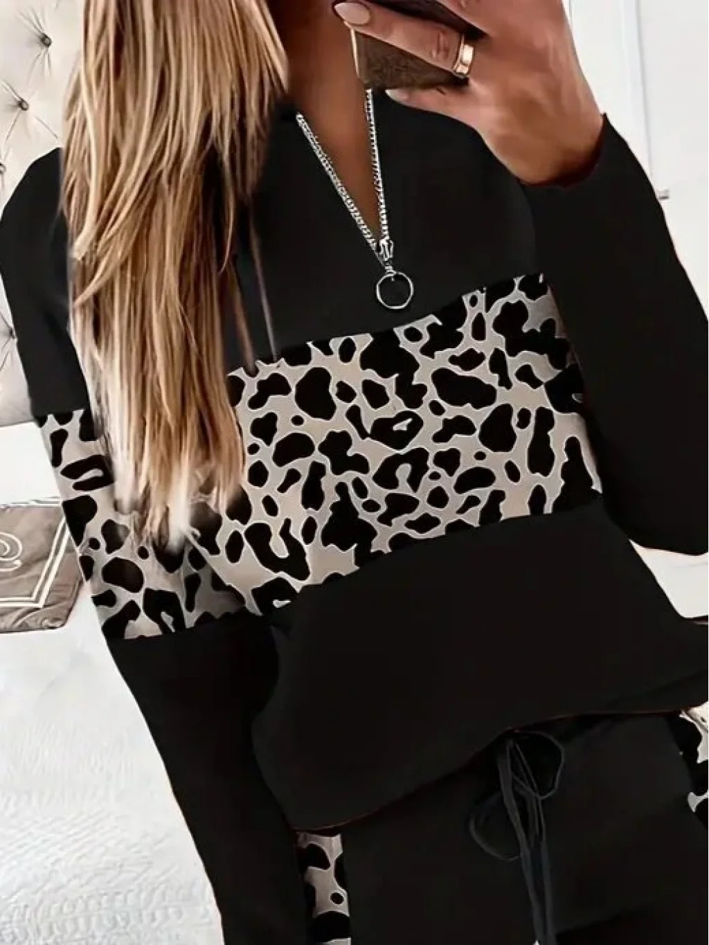Kadın Uzun Kollu Fermuarlı Karışık Desenli Viskon Iki Iplik Bluz Ve Pantolon Ikili Takım