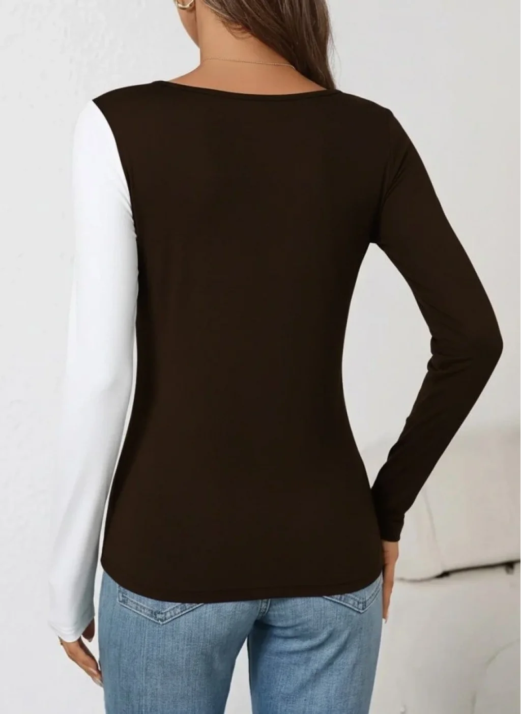 Kadın Uzun Kollu Geometrik Yaka Detaylı çift Renkli Viskon Bluz