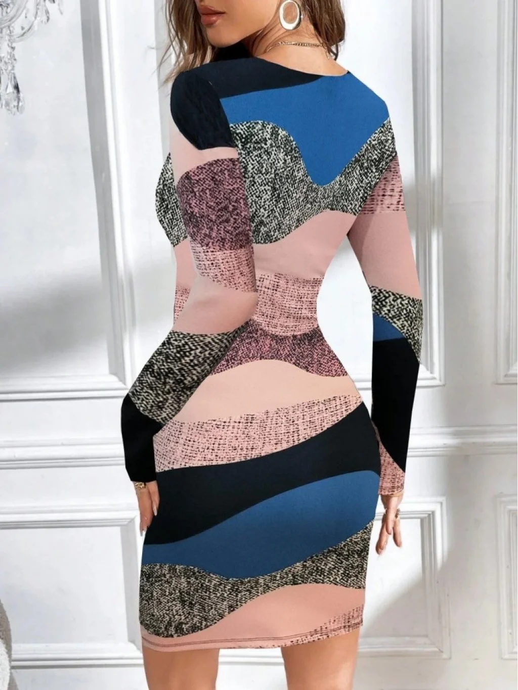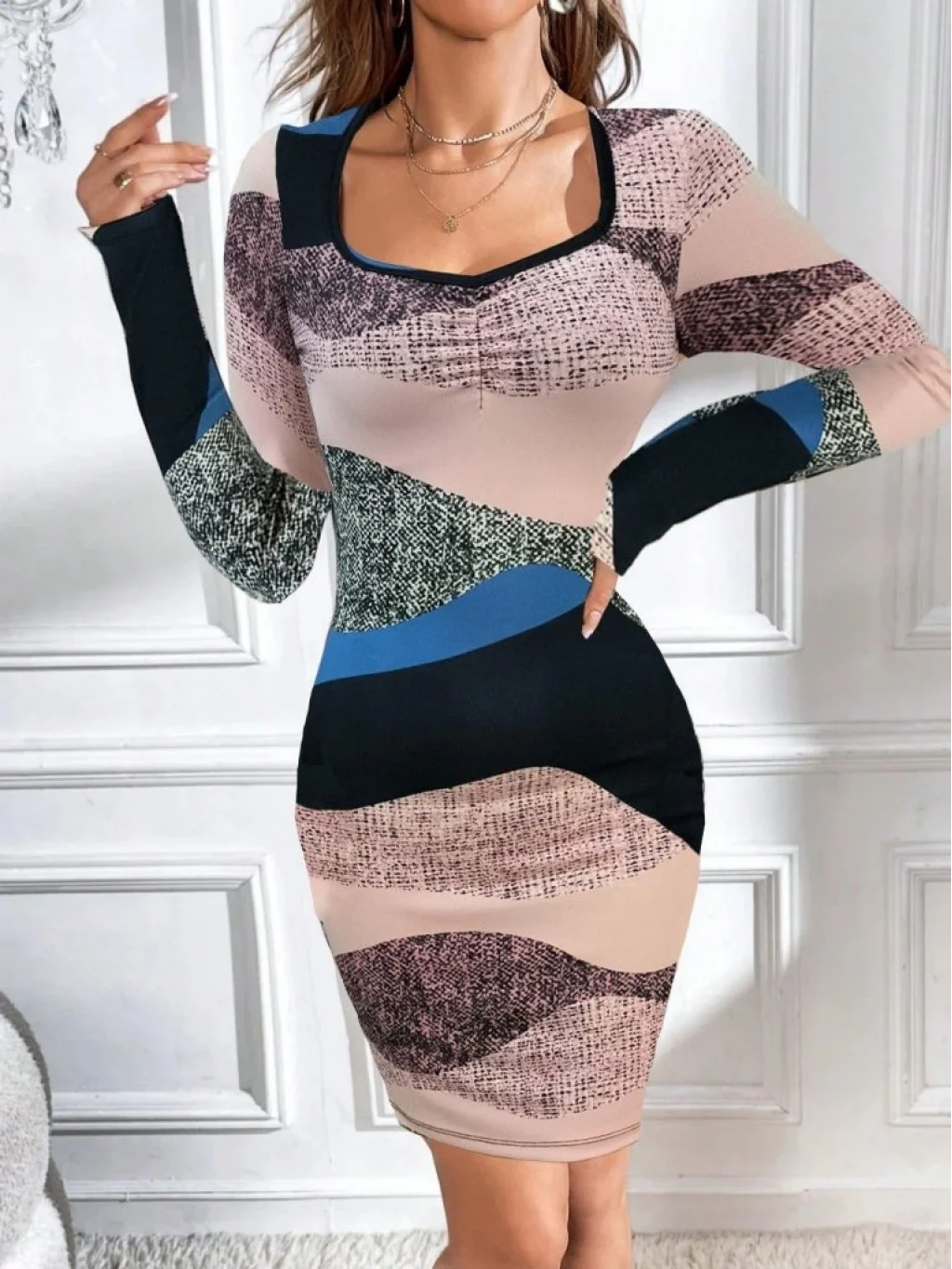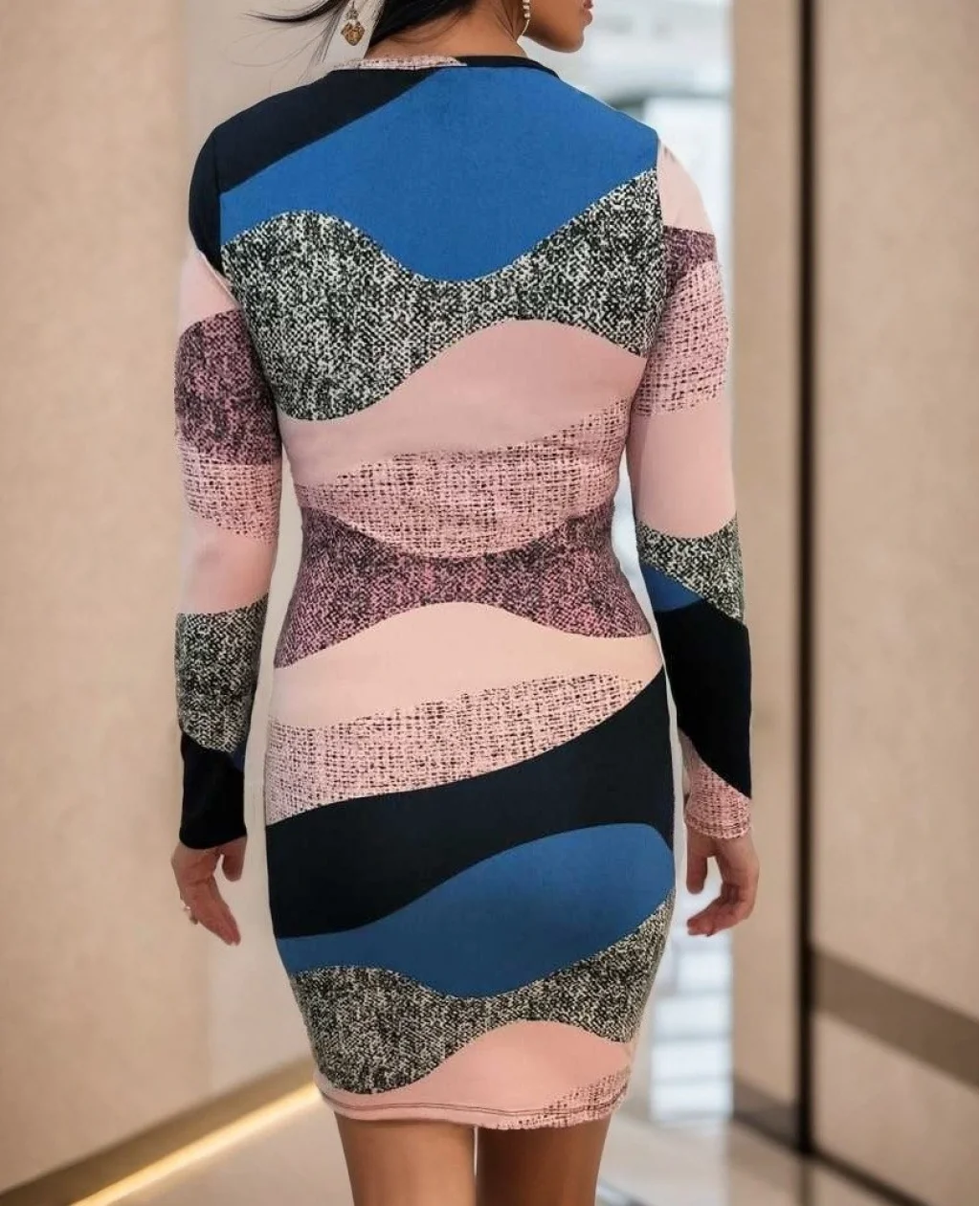 Kadın Uzun Kollu Göğüs Dekolte Detay Dalgıç Mini Elbise