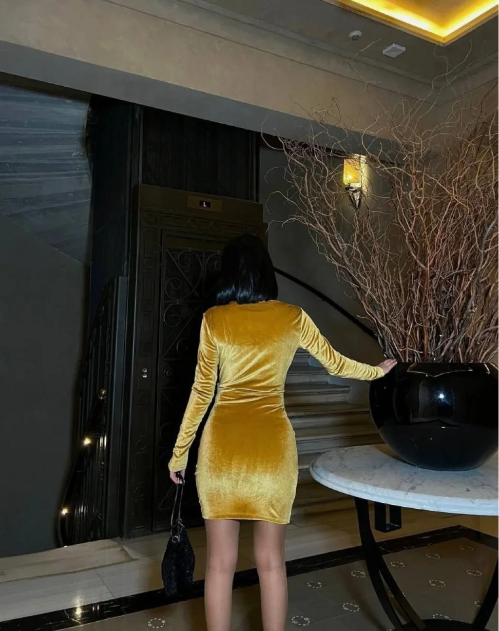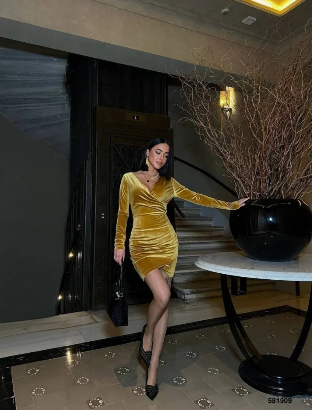 Kadın Uzun Kollu Göğüs Dekolteli Kadife Kumaş Mini Kruvaze Elbise