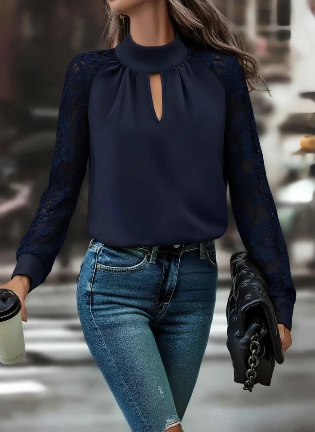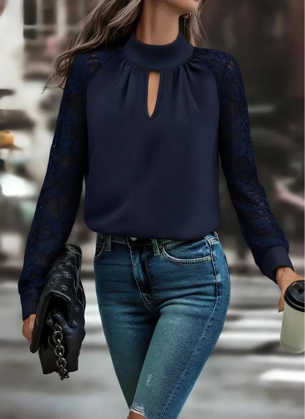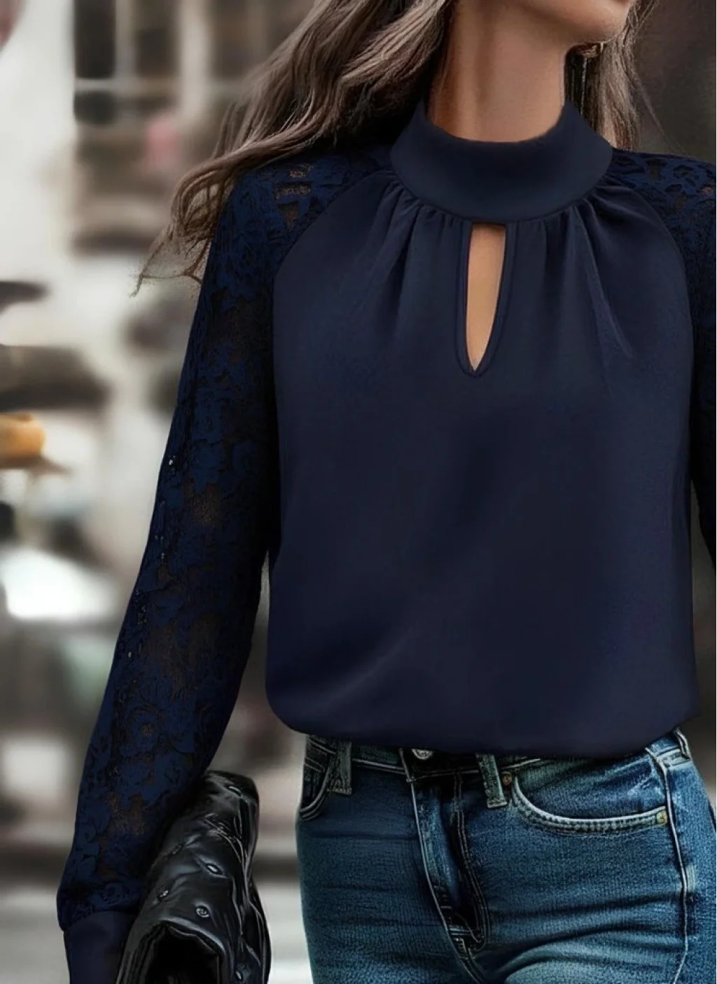 Kadın Uzun Kollu Göğüs Pencere Detay Yaka Boğazlı Kolları Tüllü Sandy Bluz