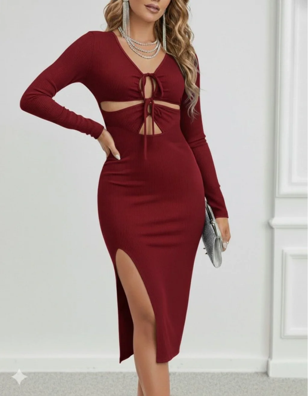 Kadın Uzun Kollu Göğüs Ve Göbek Dekolte Detay Sandy Midi Boy Elbise