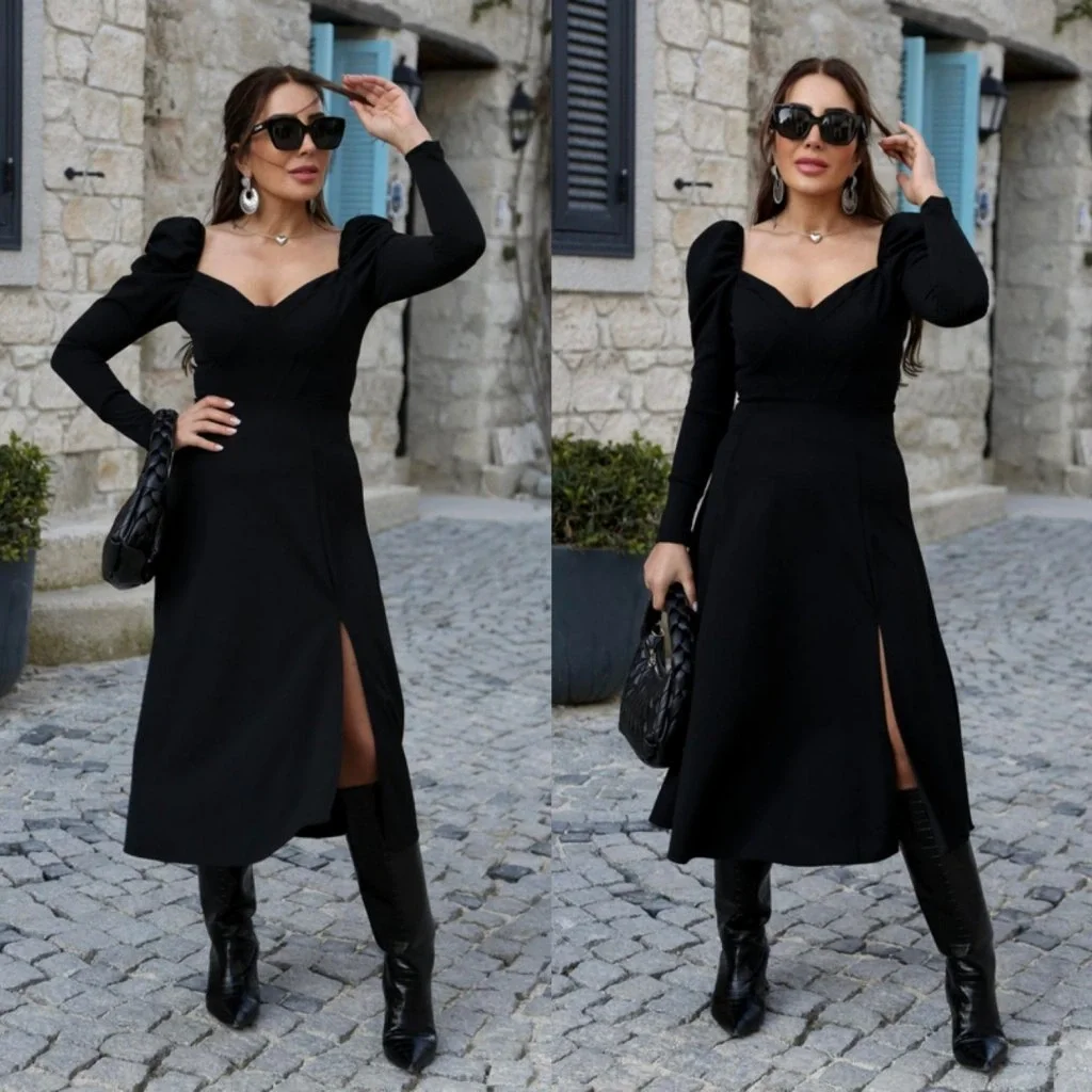 Kadın Uzun Kollu Göğüs Ve Sırt Dekolteli Krep Midi Boy Elbise