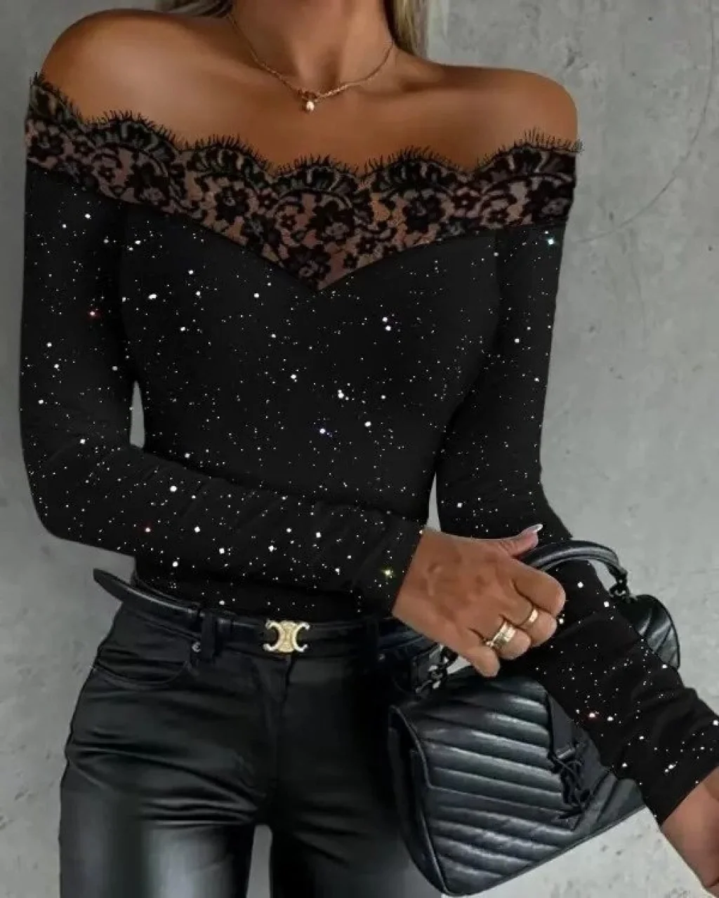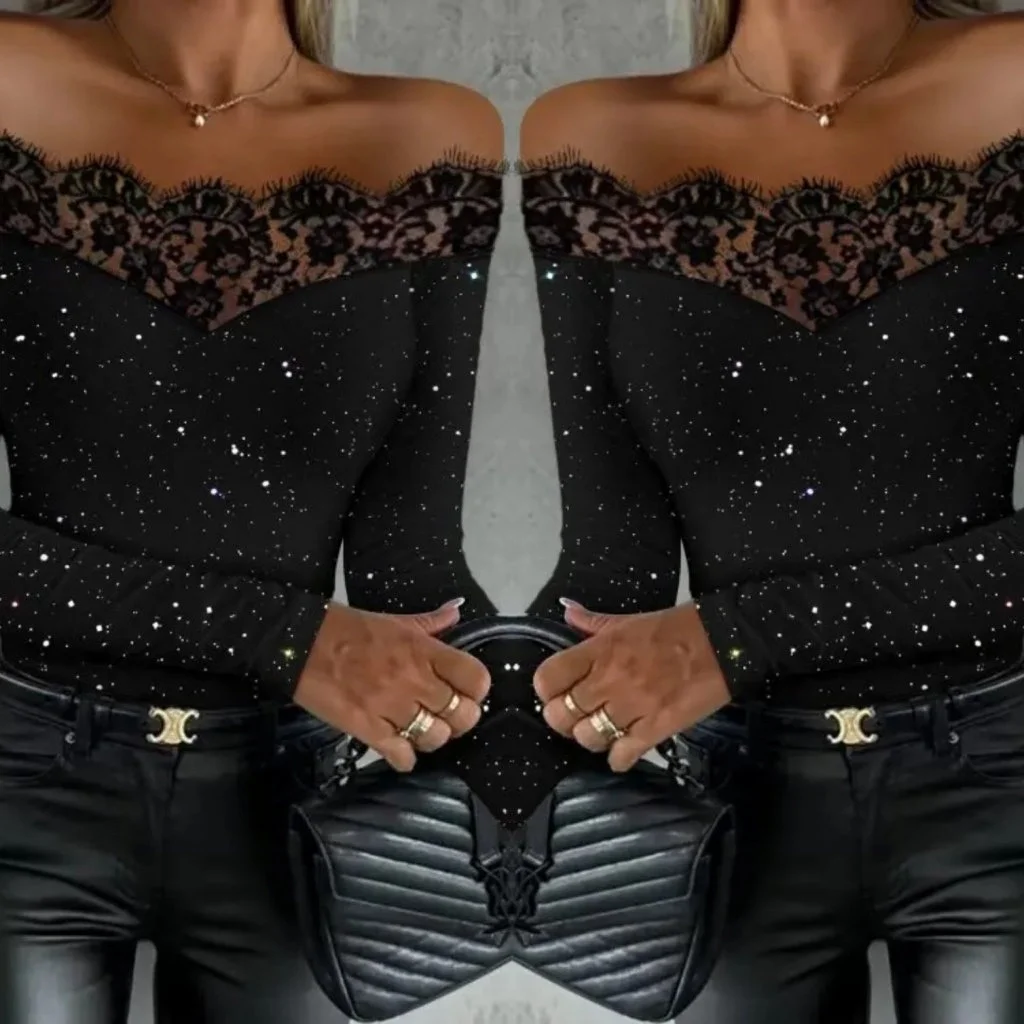 Kadın Uzun Kollu Güpürlü Madonna Yaka Taşlı Mikro Bluz