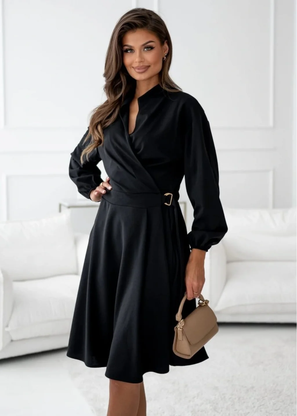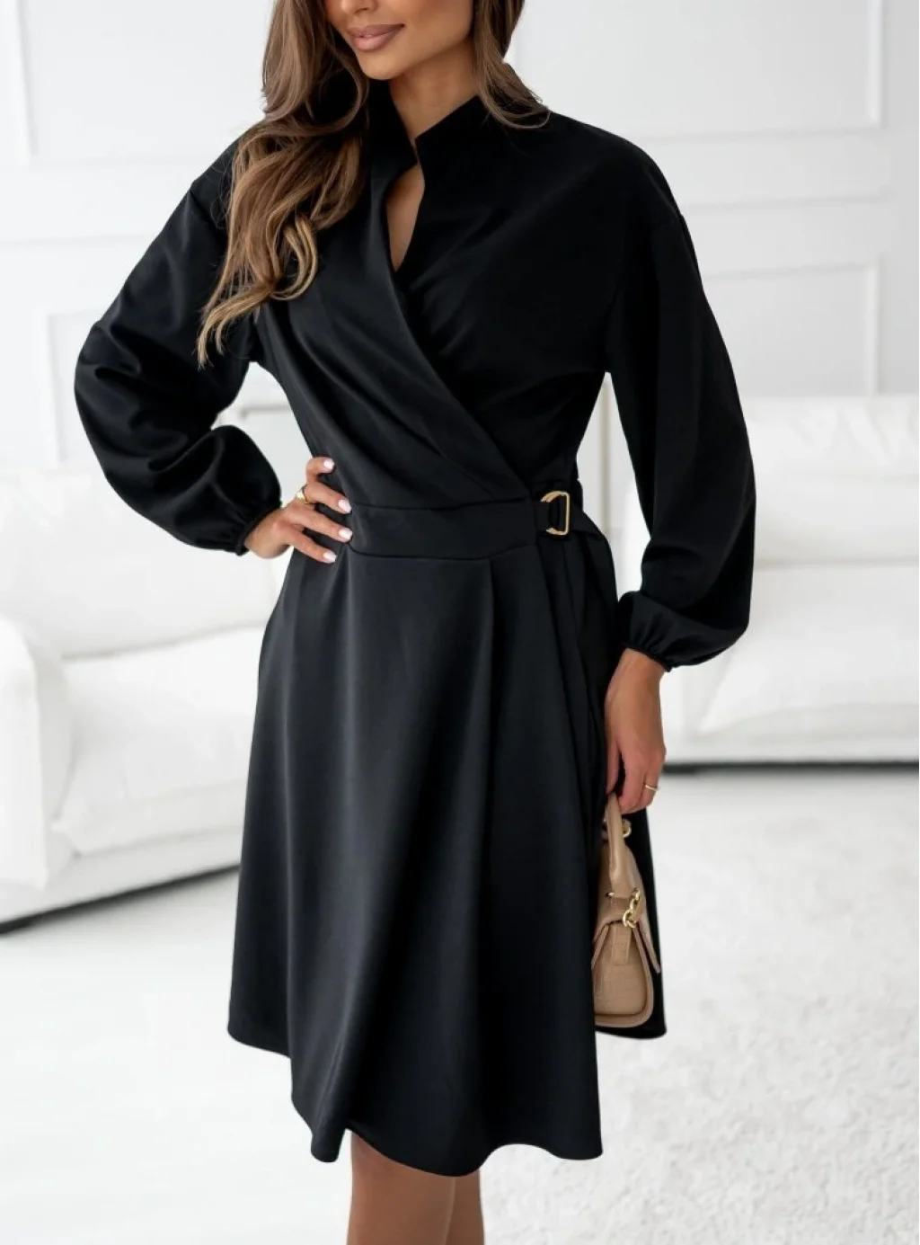Kadın Uzun Kollu Hakim V Yakalı Yandan Toka Detaylı Ithal Mini Krep Elbise