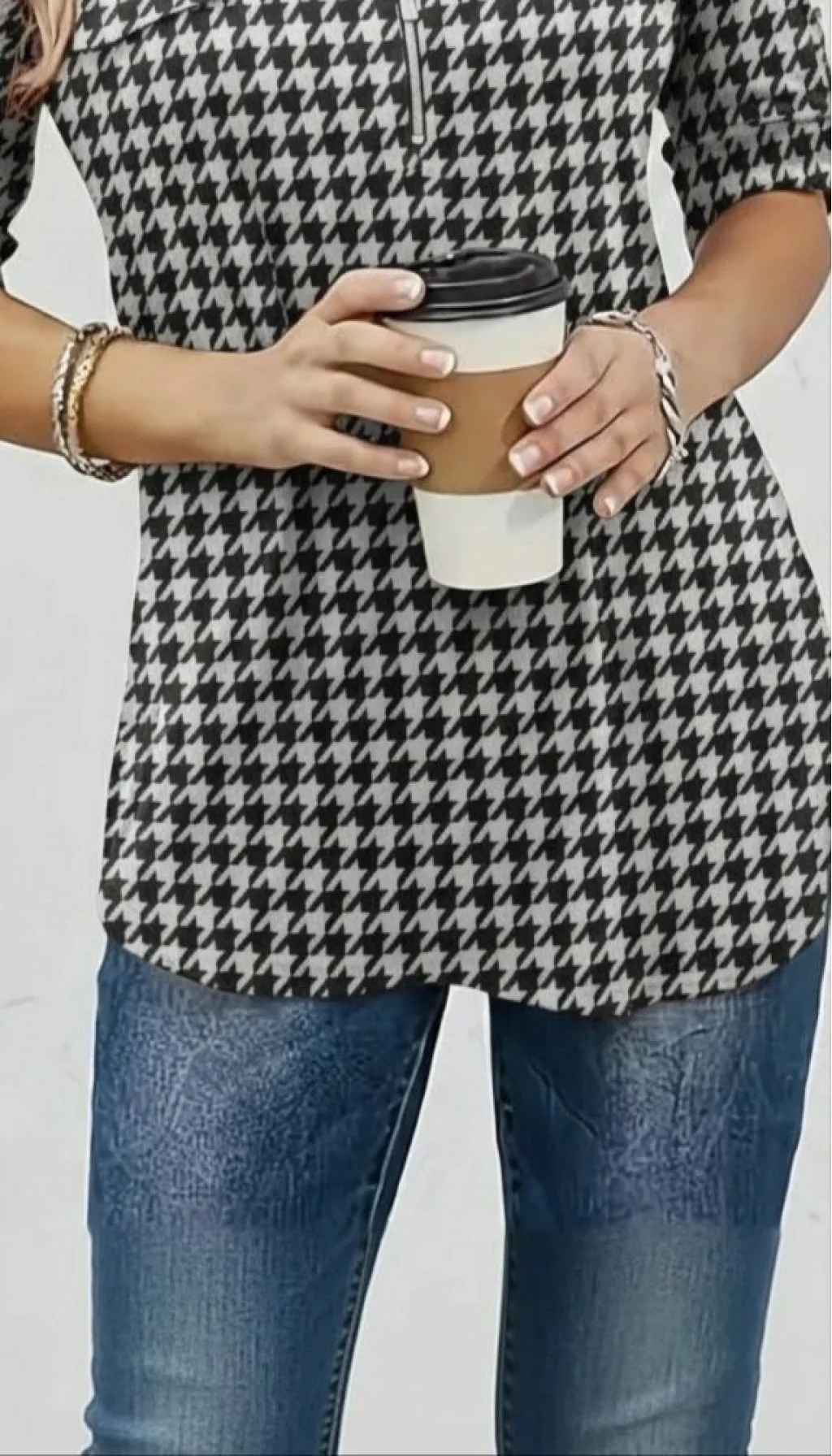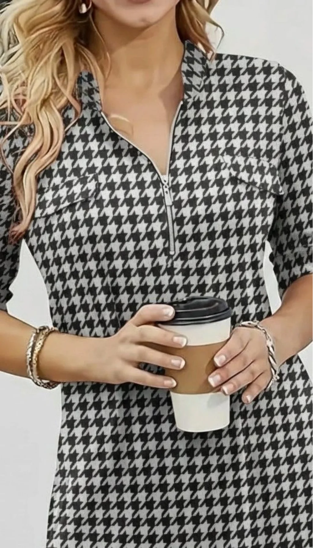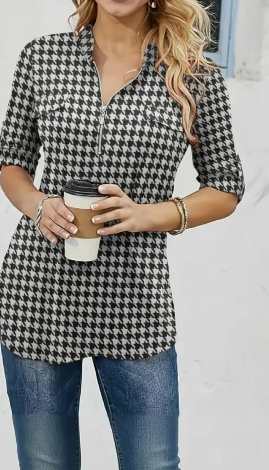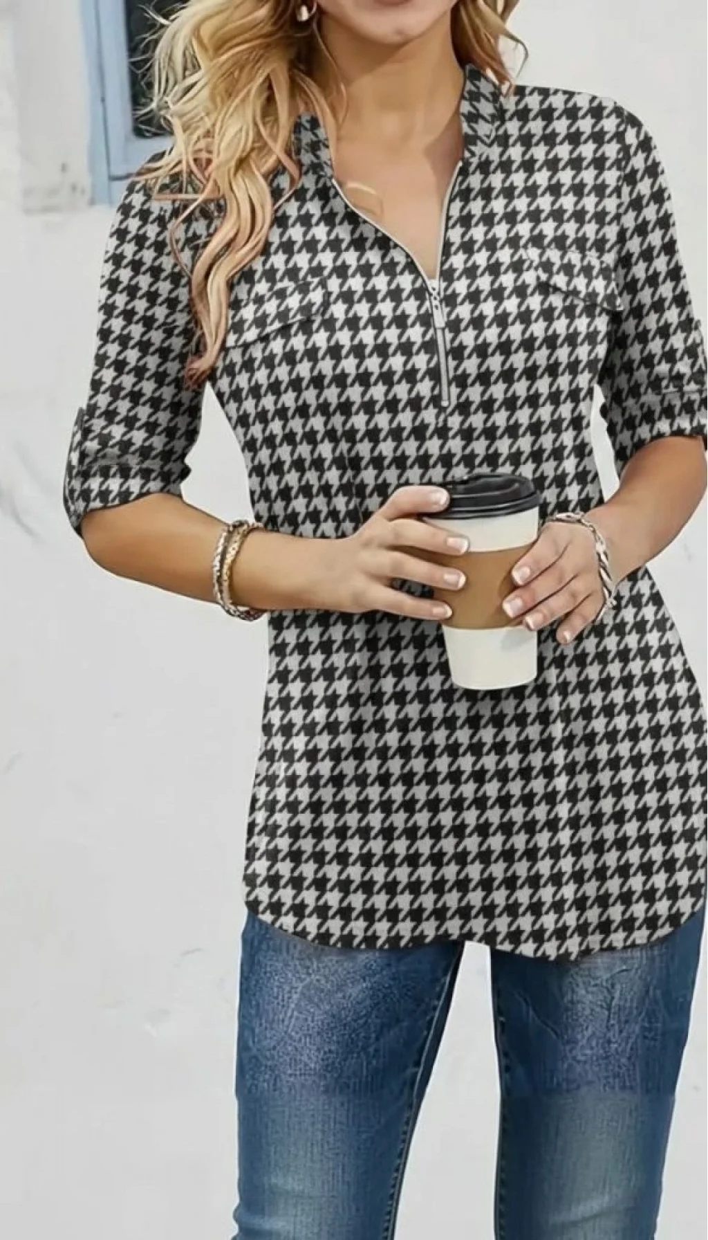 Kadın Uzun Kollu Hakim Yaka Yakadan Fermuarlı Geometrik Desenli Süprem Bluz
