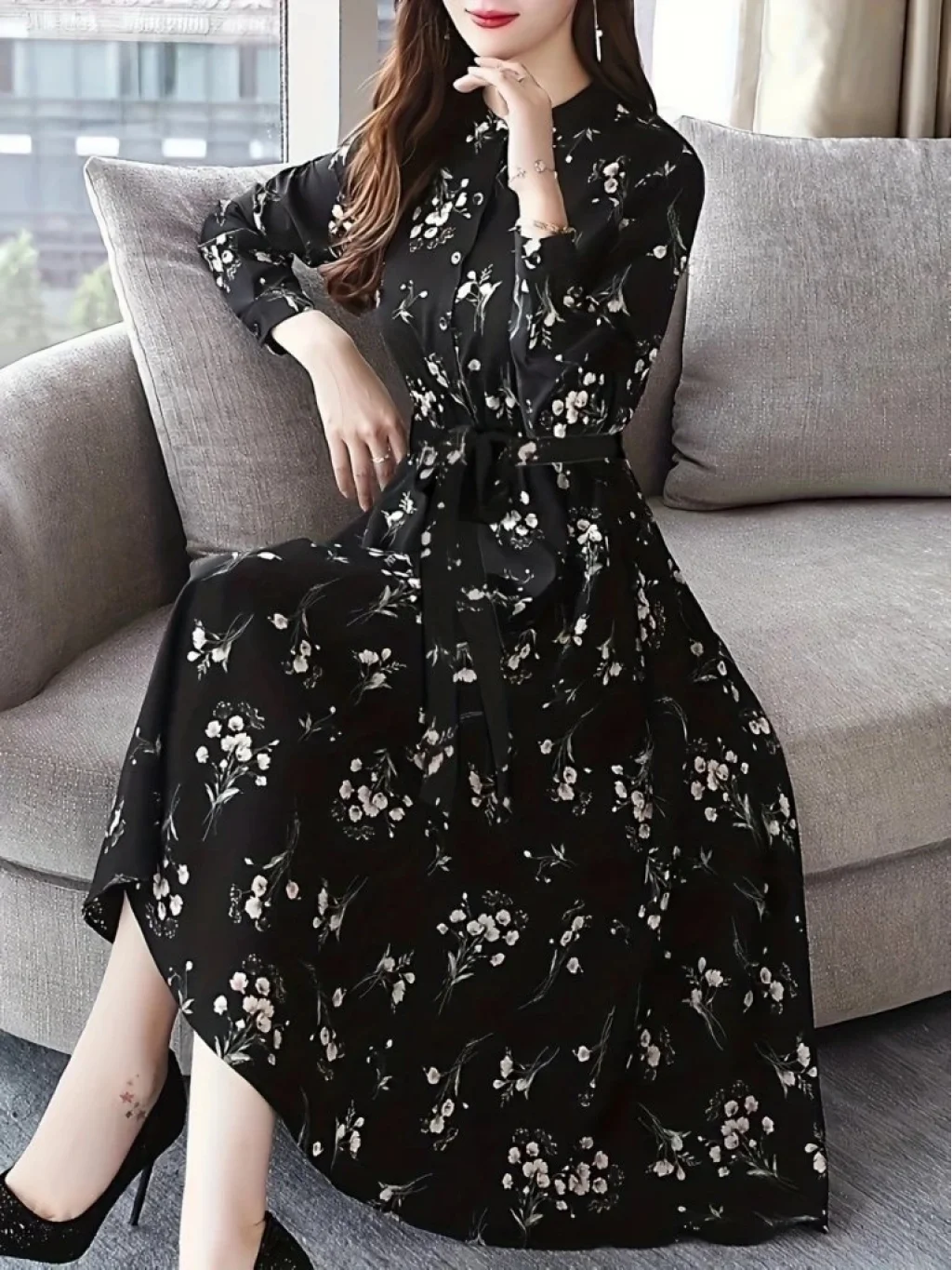 Kadın Uzun Kollu Hakim Yakalı Düğmeli Kuşaklı Desenli Maxi Mikro Süprem Elbise