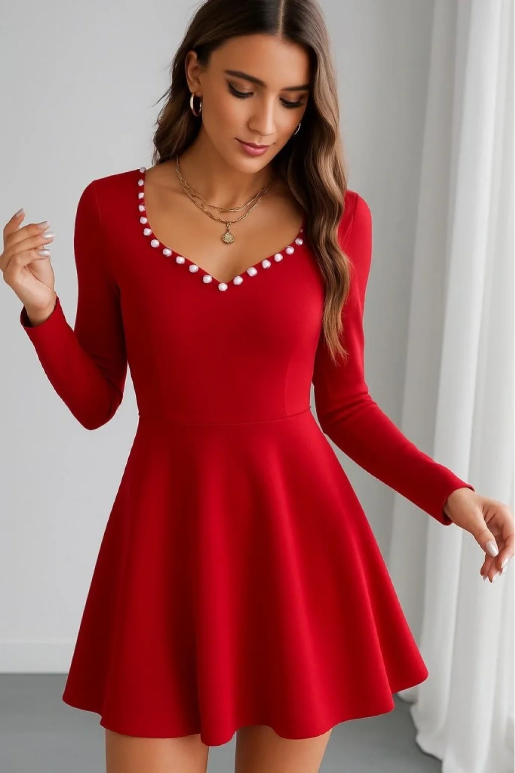 Kadın Uzun Kollu Inci Yakalı Kısa Ithal Krep Elbise