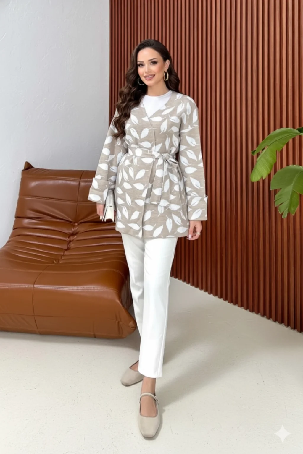 Kadın Uzun Kollu Kadın Uzun Kollu Yaprak Desen Kuşak Dahil Hırka
