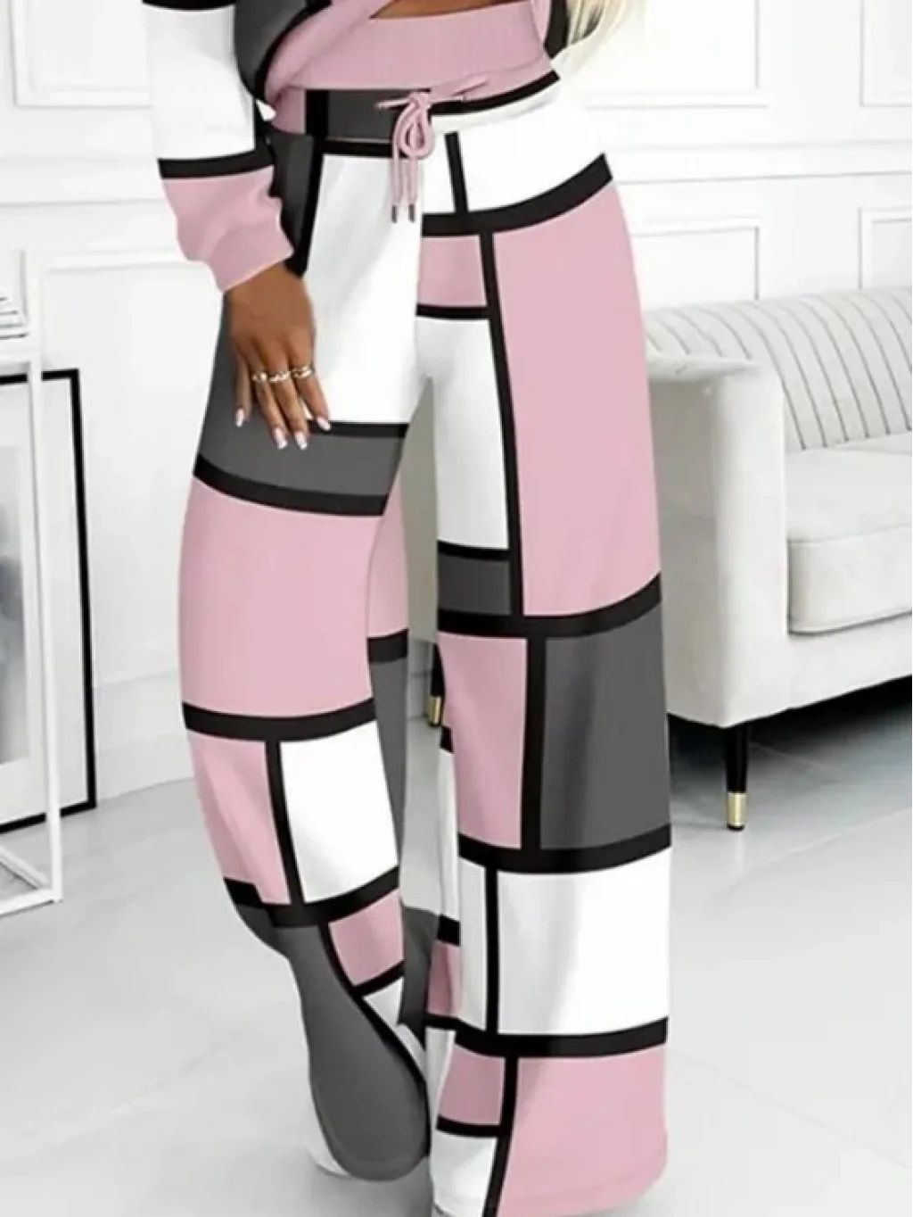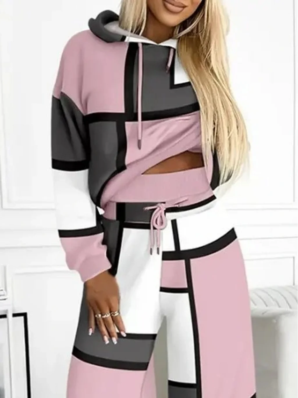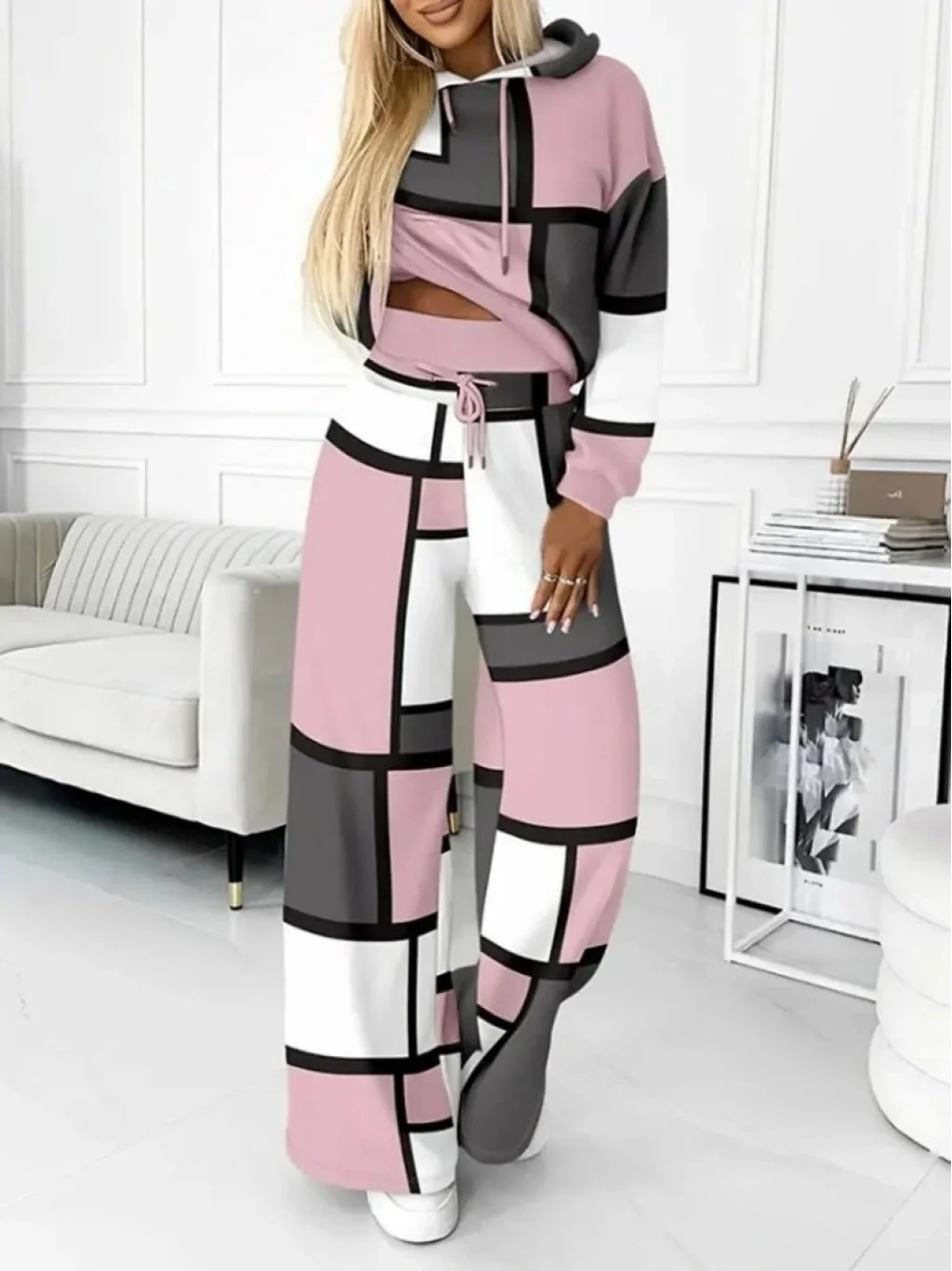 Kadın Uzun Kollu Kapşonlu Bağcıklı Desenli Iki Iplik Bluz Ve Pantolon Ikili Takım