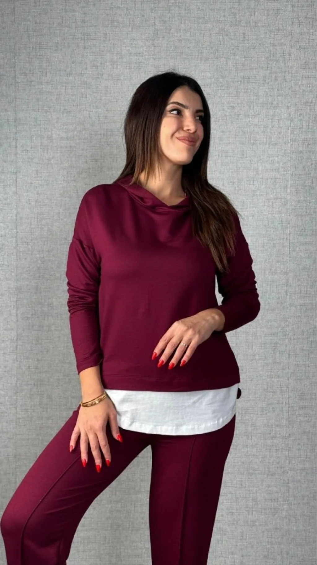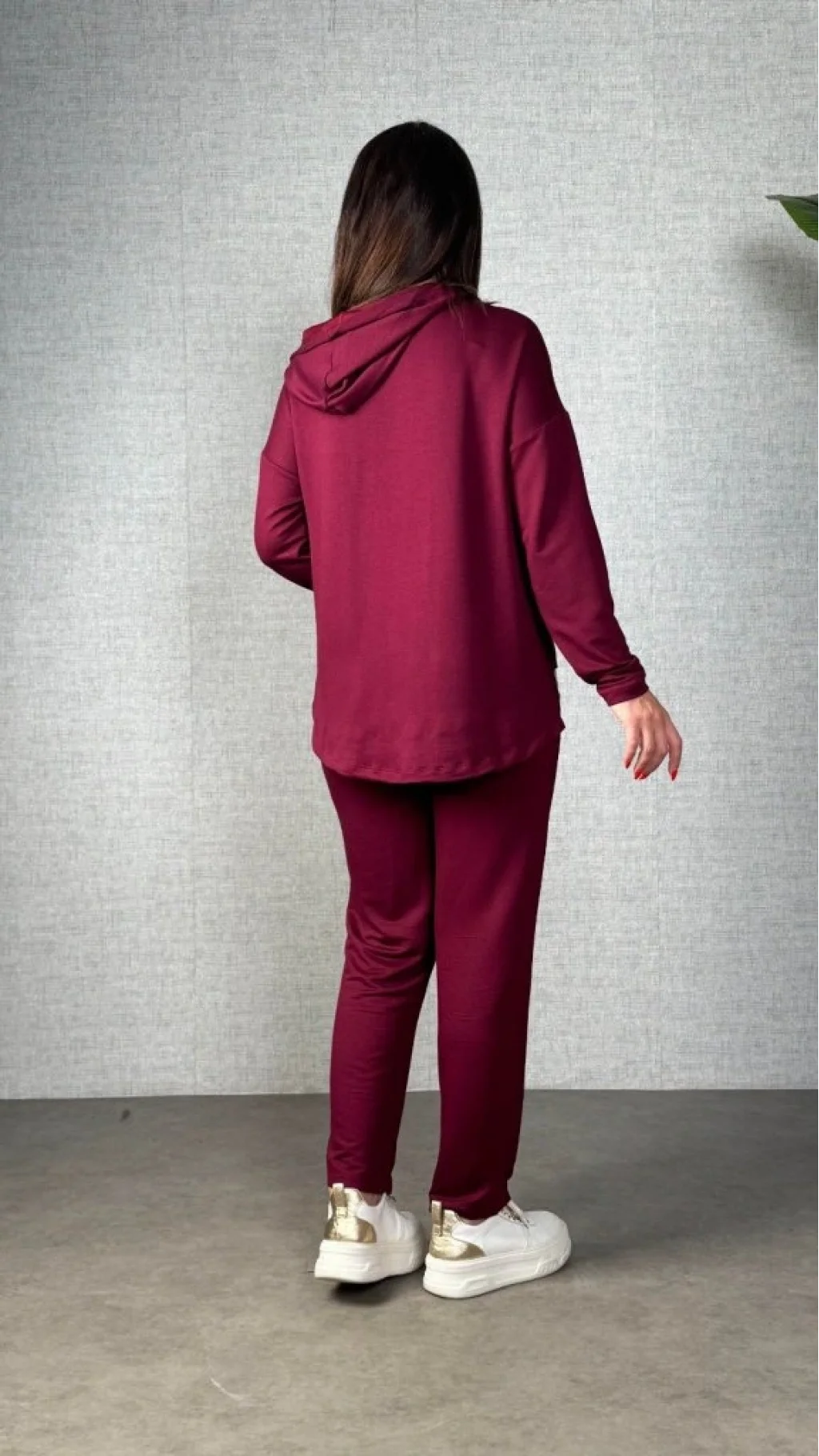 Kadın Uzun Kollu Kapşonlu Bağcıklı Viskon Iki Iplik Bluz Ve Pantolon Ikili Takım
