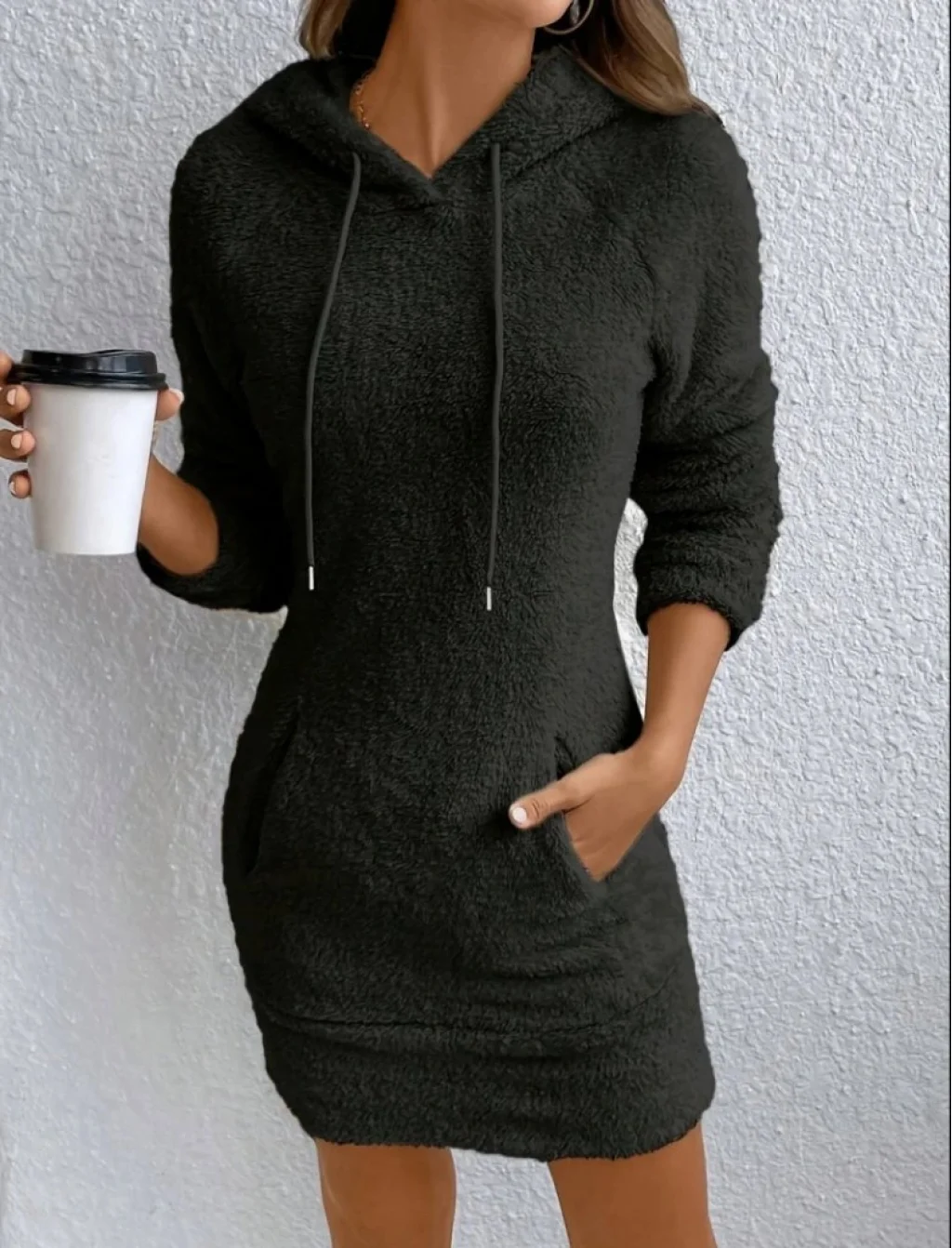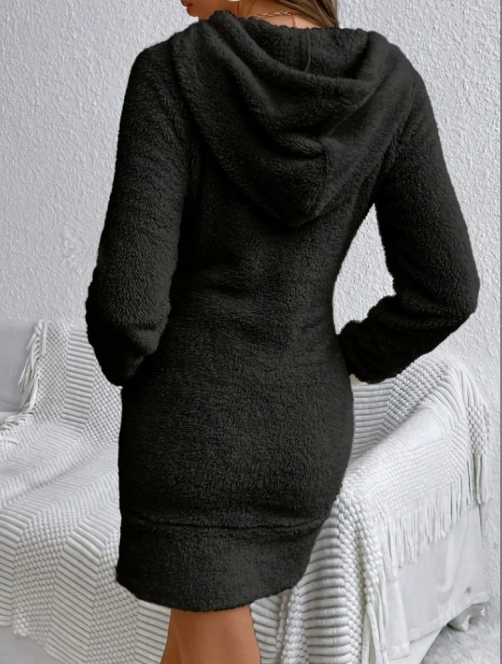 Kadın Uzun Kollu Kapşonlu Cepli Mini Peluş Elbise