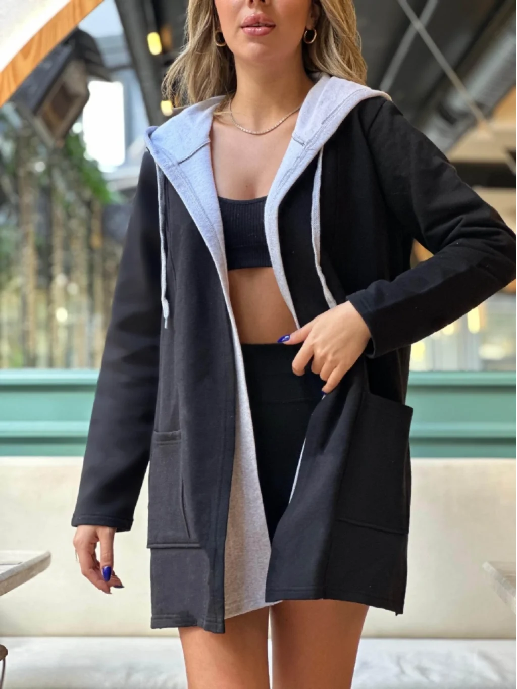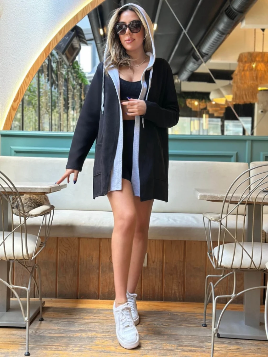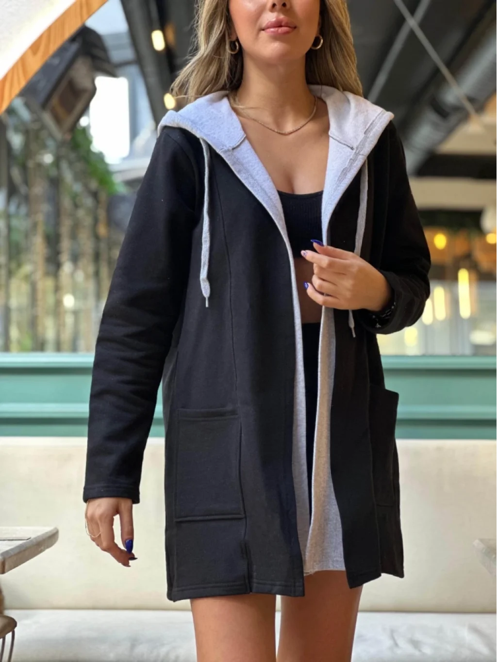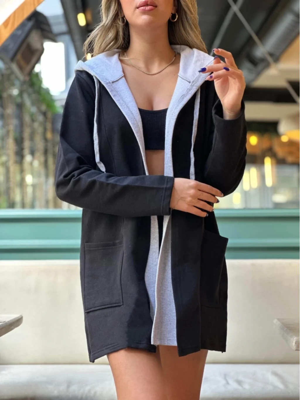 Kadın Uzun Kollu Kapşonlu çift Renkli şardonlu Iki Iplik Ceket
