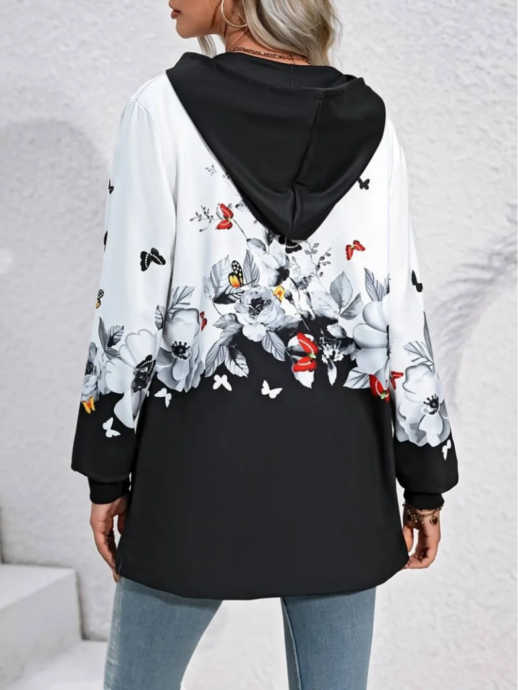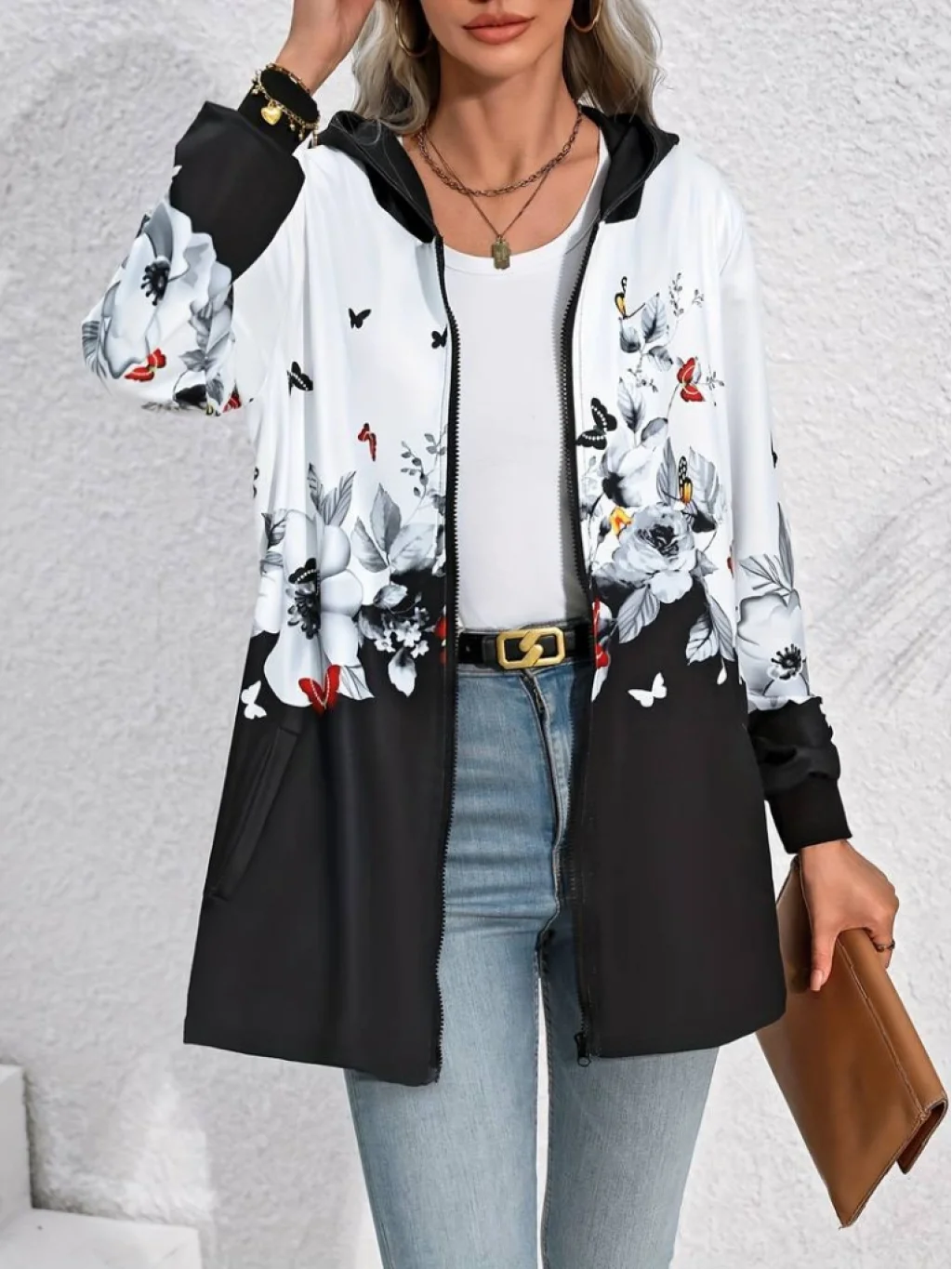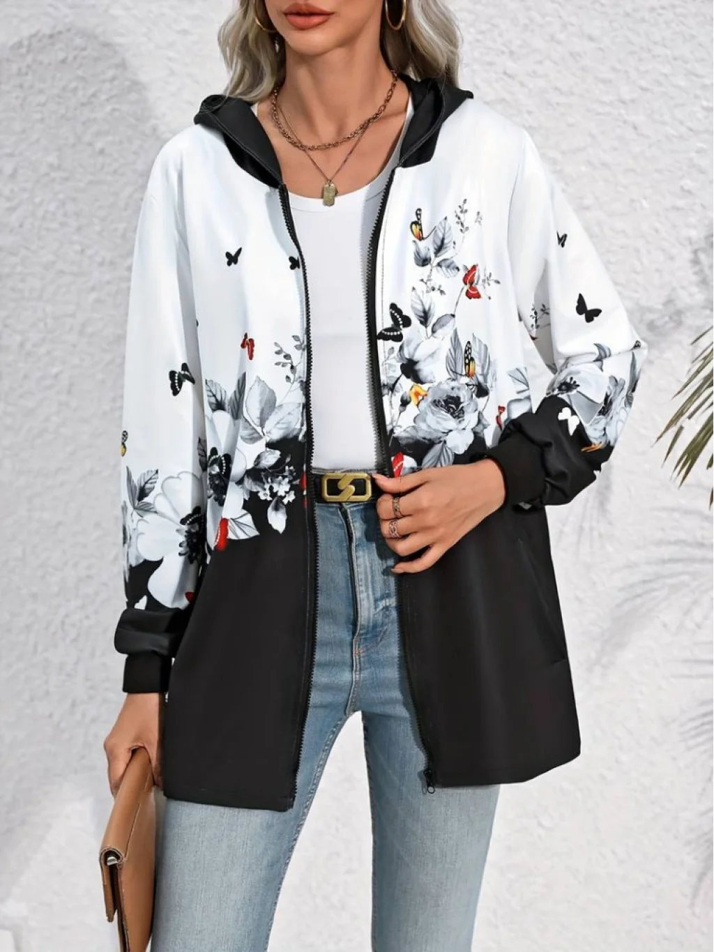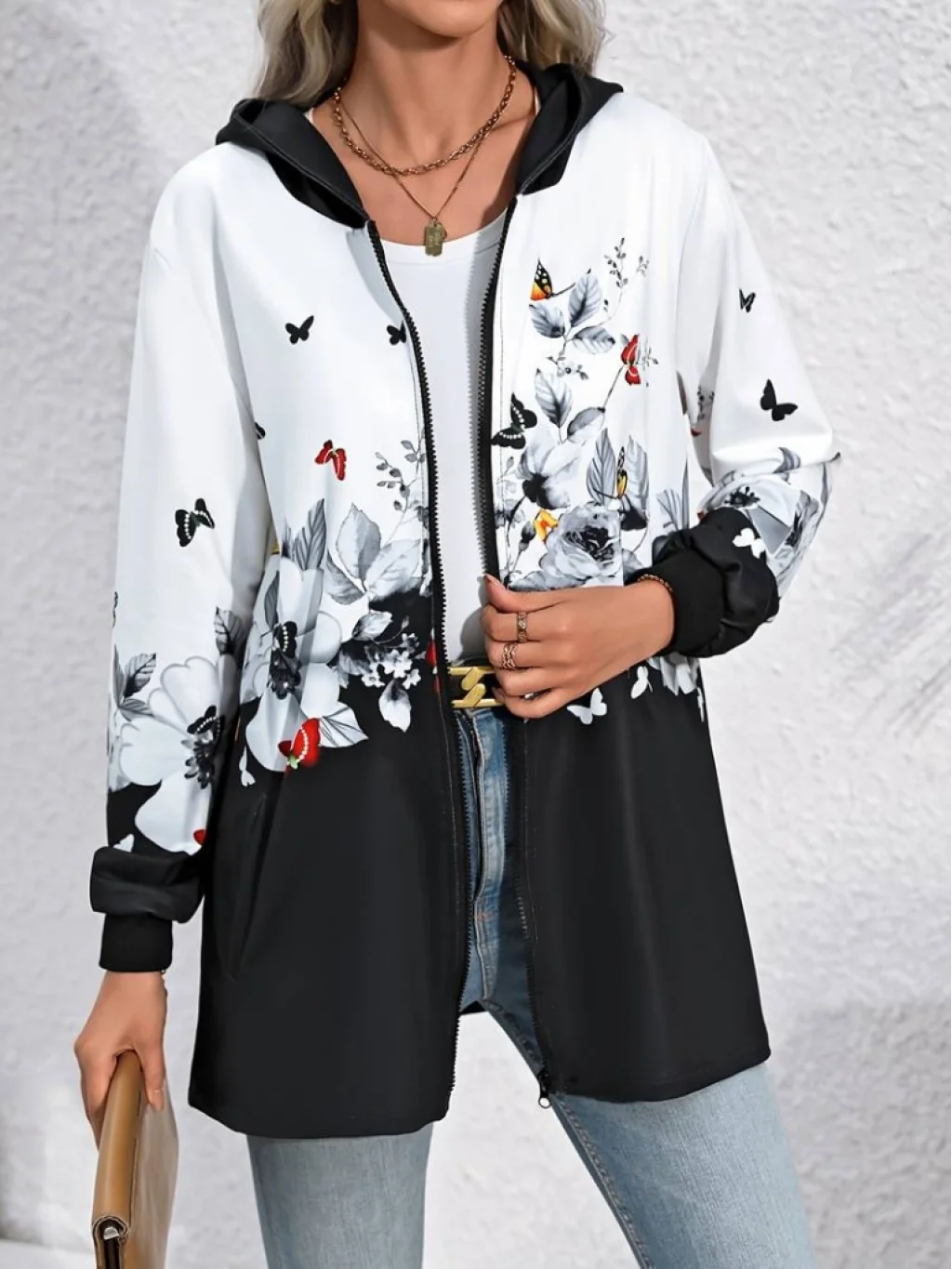 Kadın Uzun Kollu Kapşonlu Fermuarlı çiçek-kelebek Desenli şardonlu Dalgıç Ceket