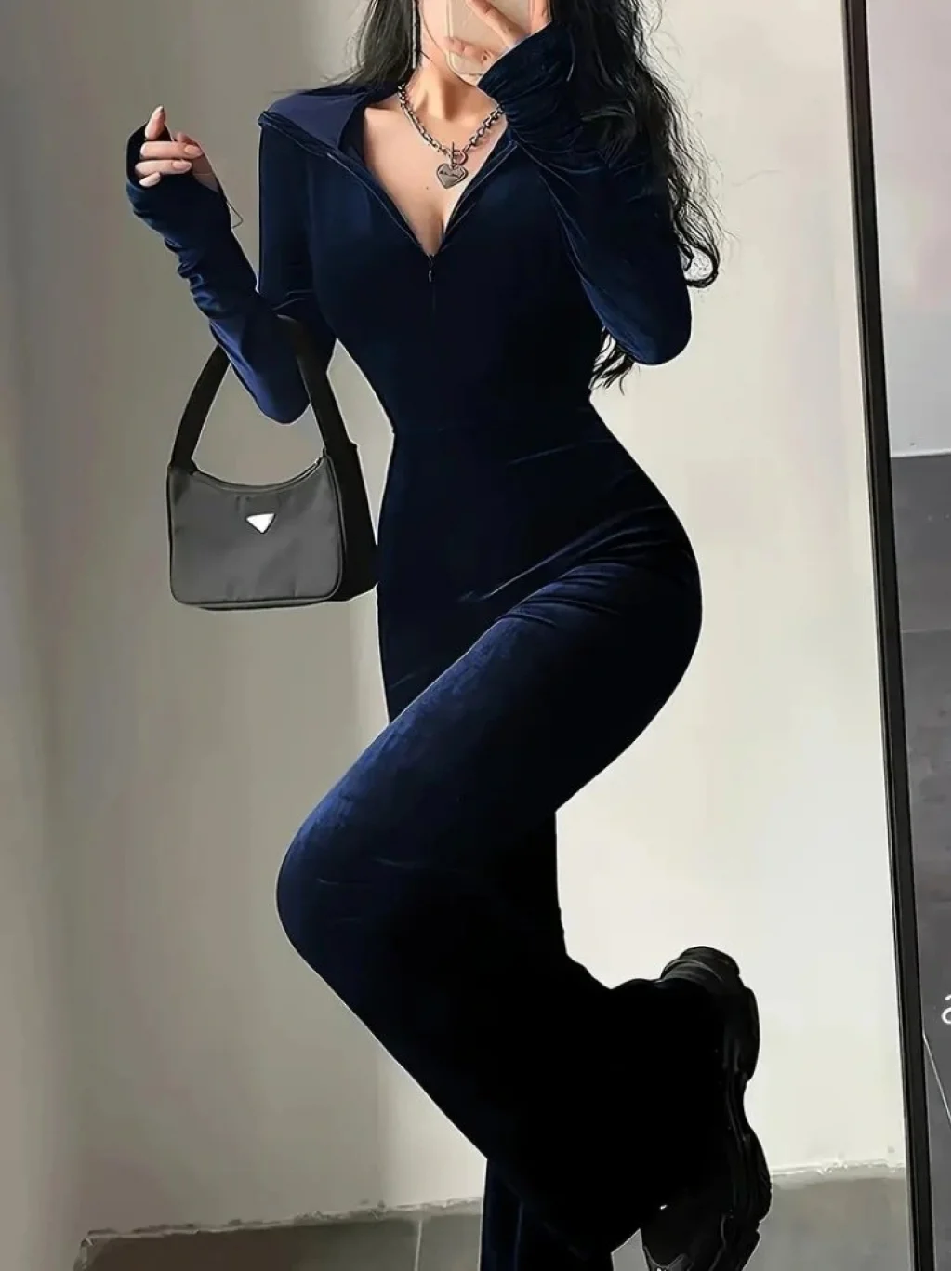 Kadın Uzun Kollu Kapşonlu Fermuarlı Kadife Tulum