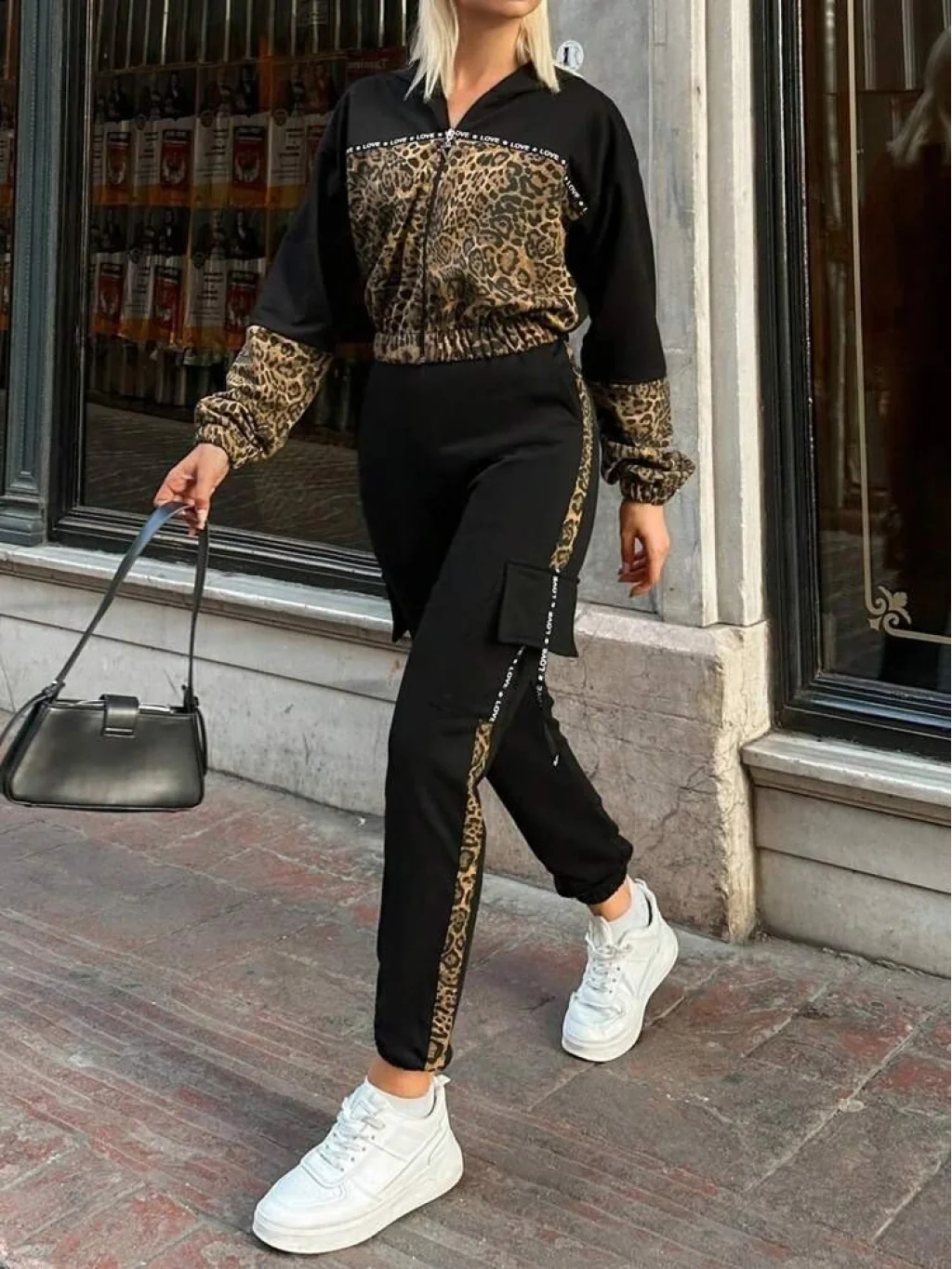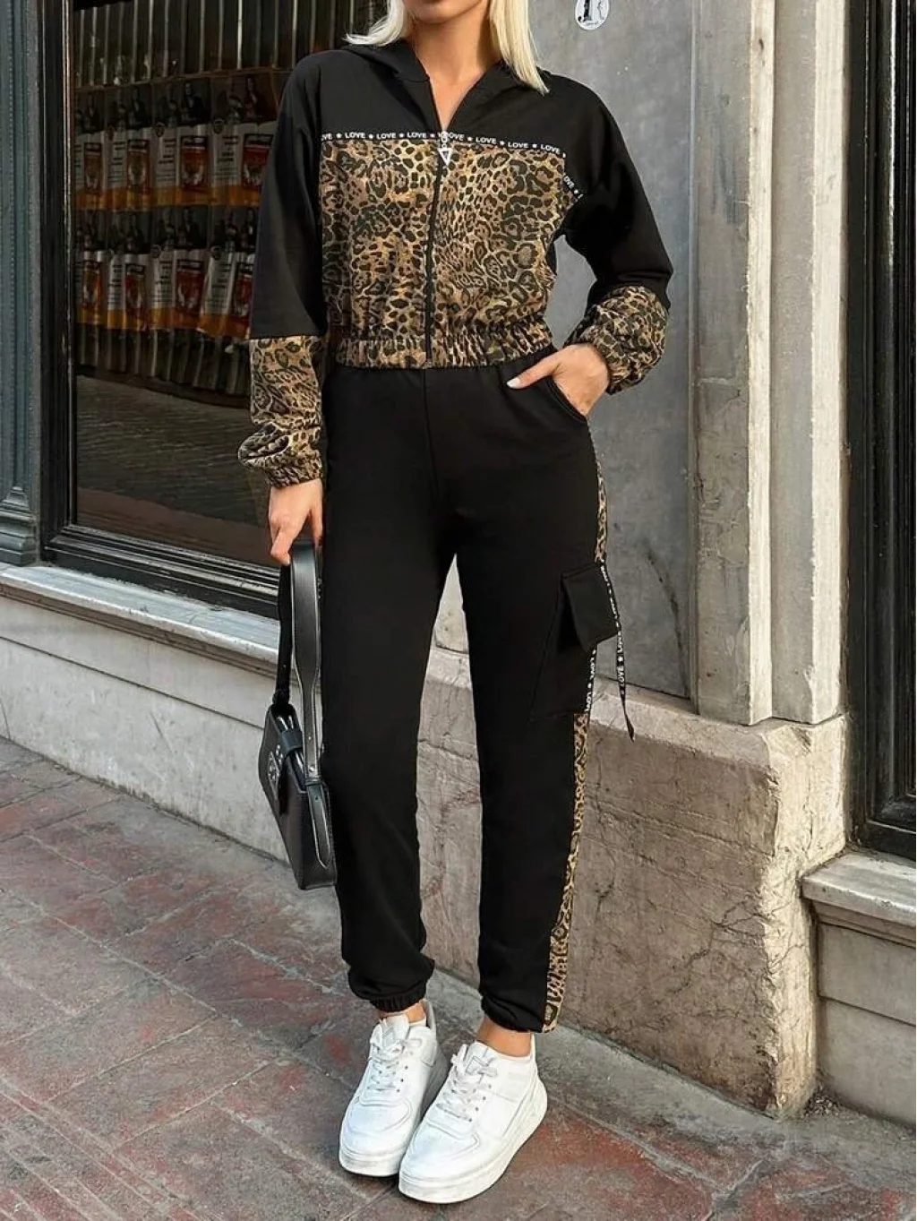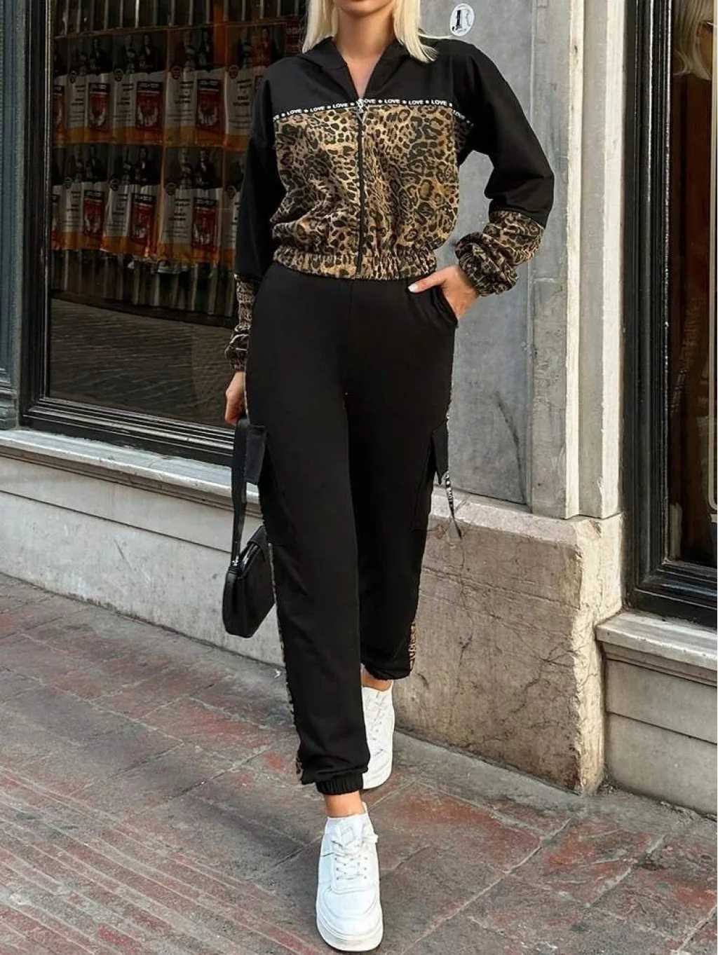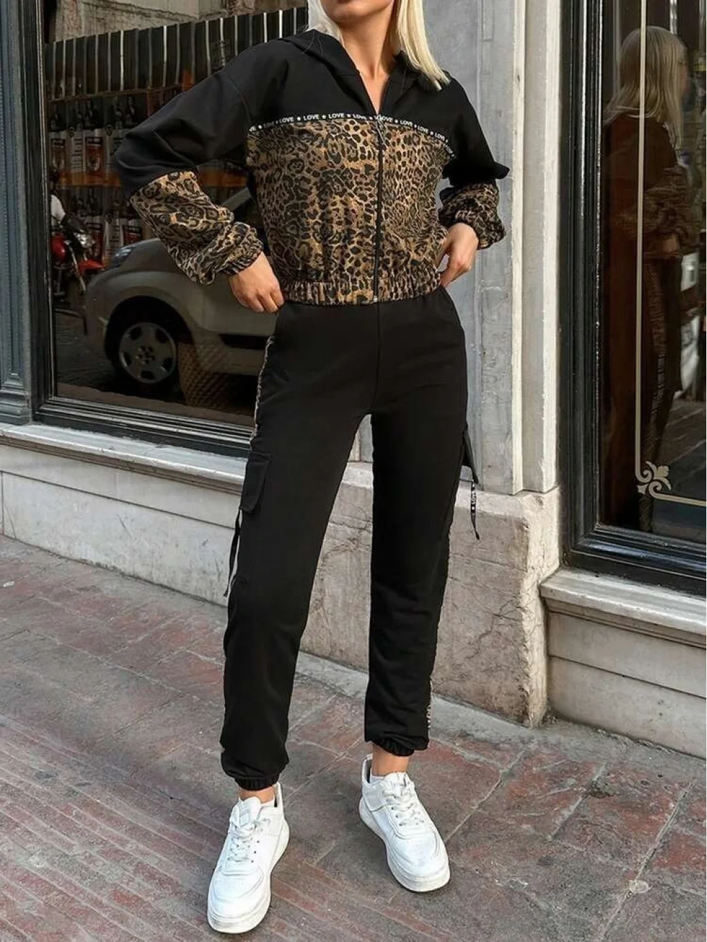 Kadın Uzun Kollu Kapşonlu Leopar Desenli Viskon Iki Iplik Bluz Ve Pantolon Ikili Takım