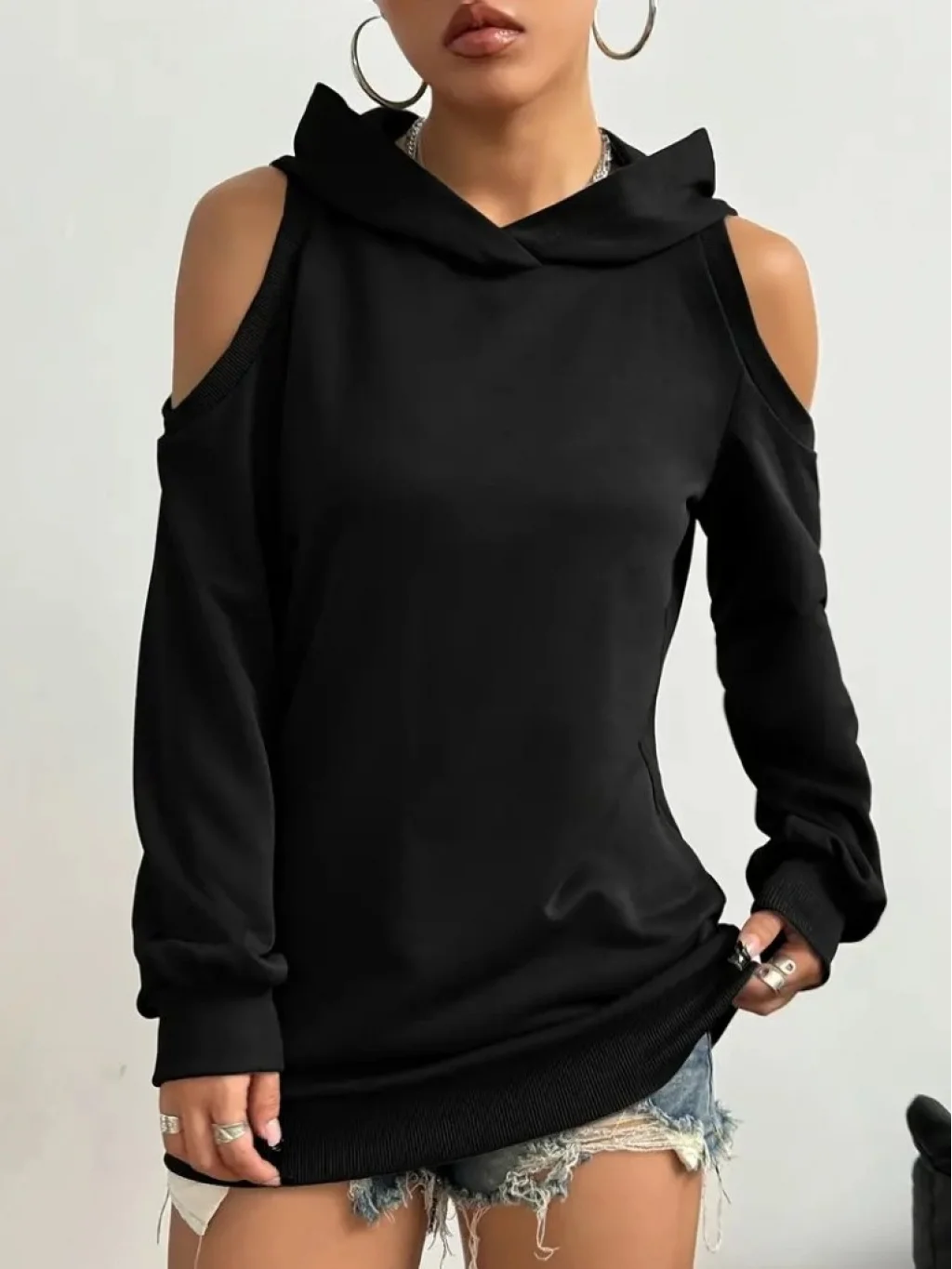 Kadın Uzun Kollu Kapşonlu Omuzlardan Açık Viskon Iki Iplik Bluz