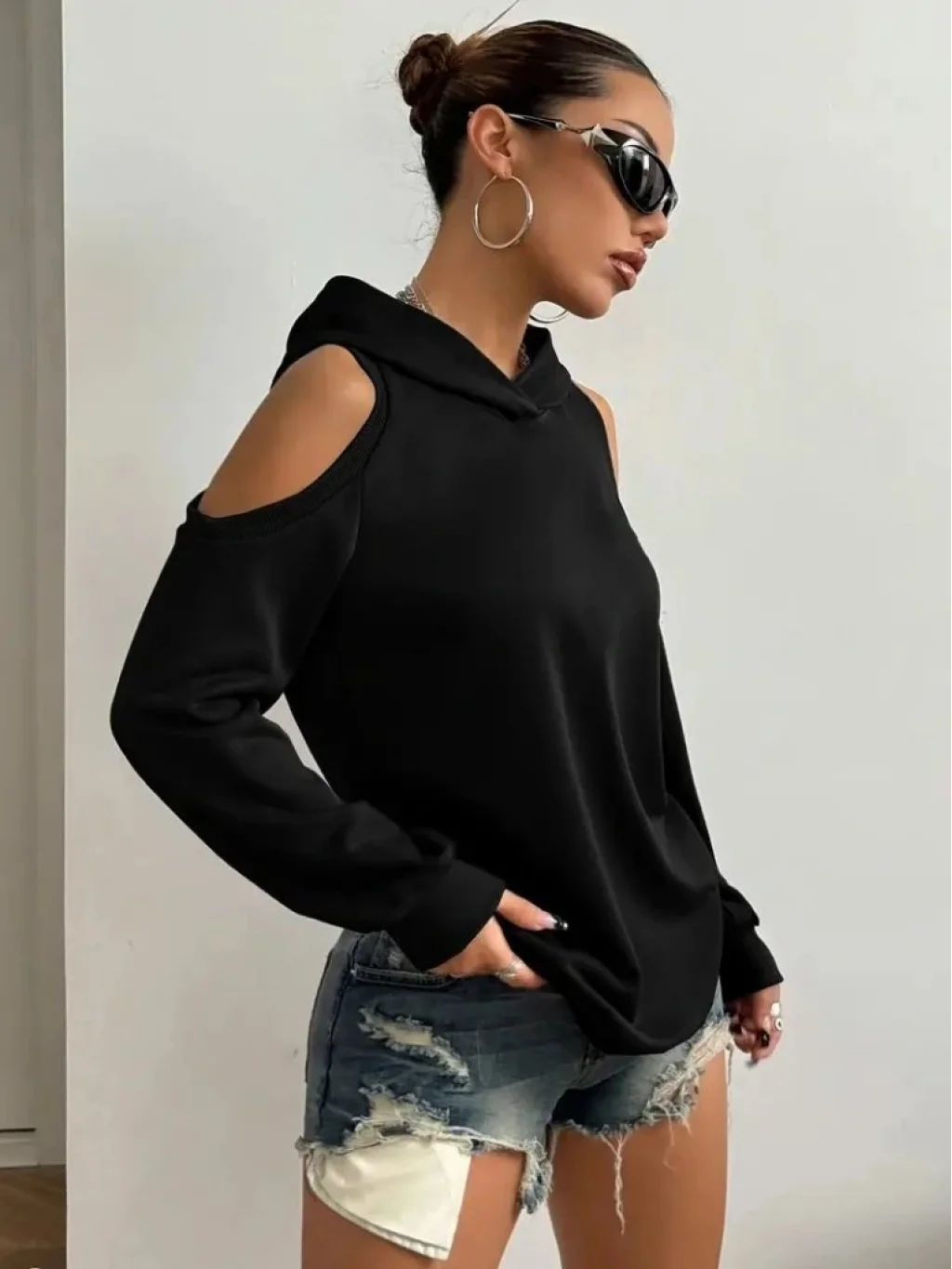 Kadın Uzun Kollu Kapşonlu Omuzlardan Açık Viskon Iki Iplik Bluz