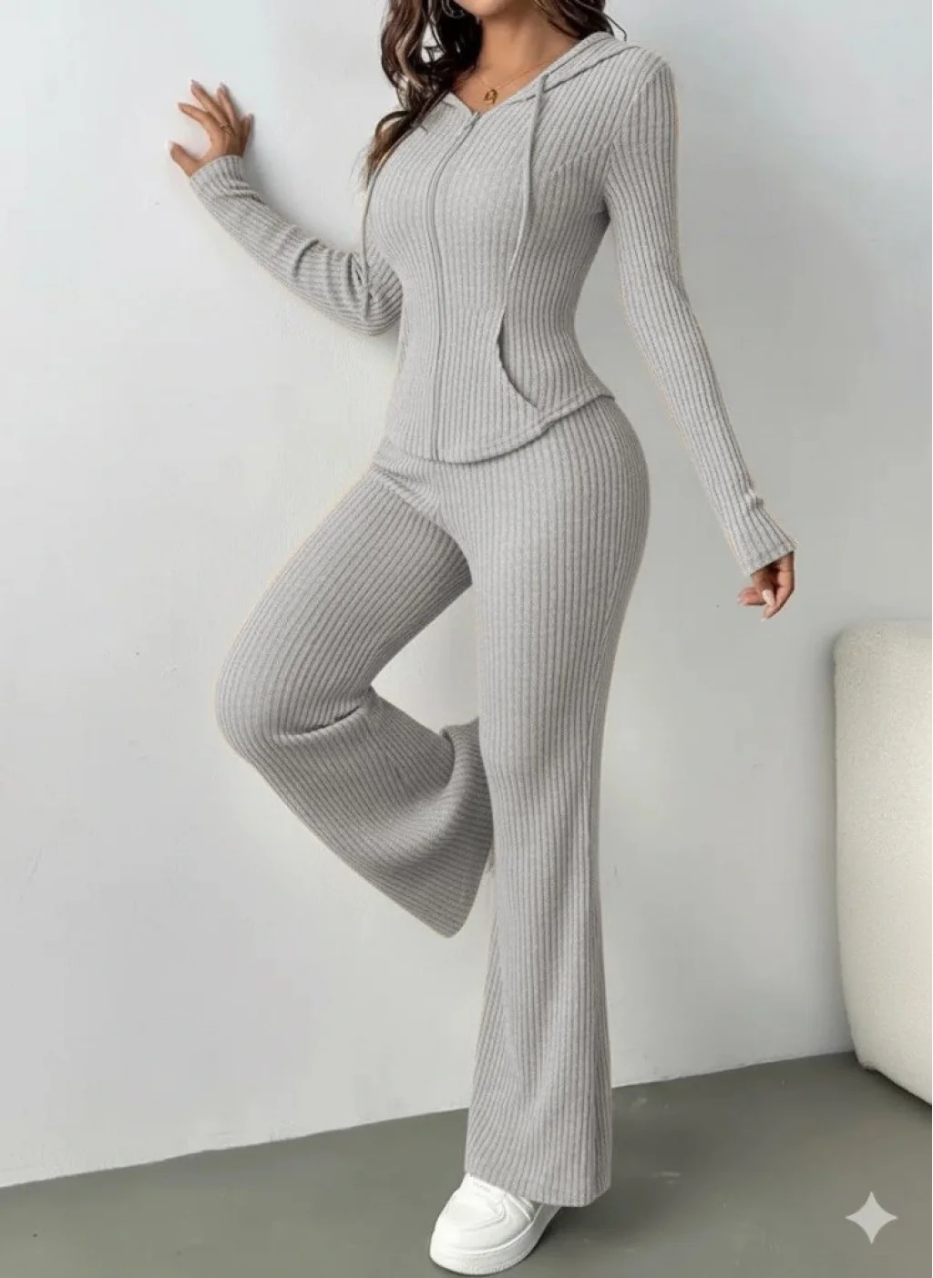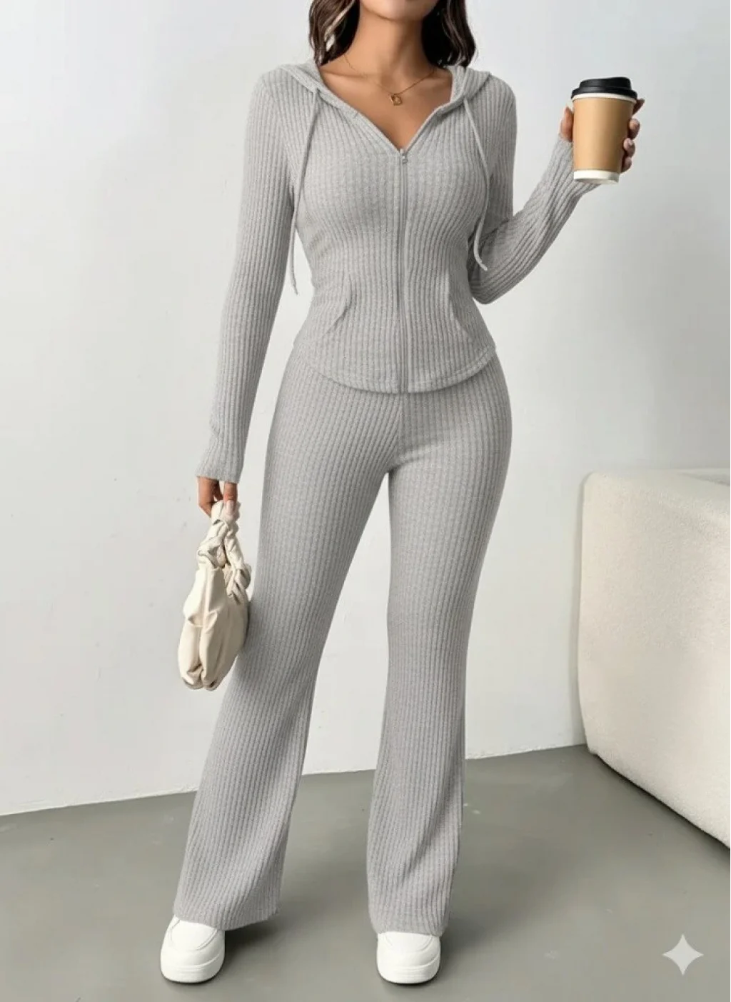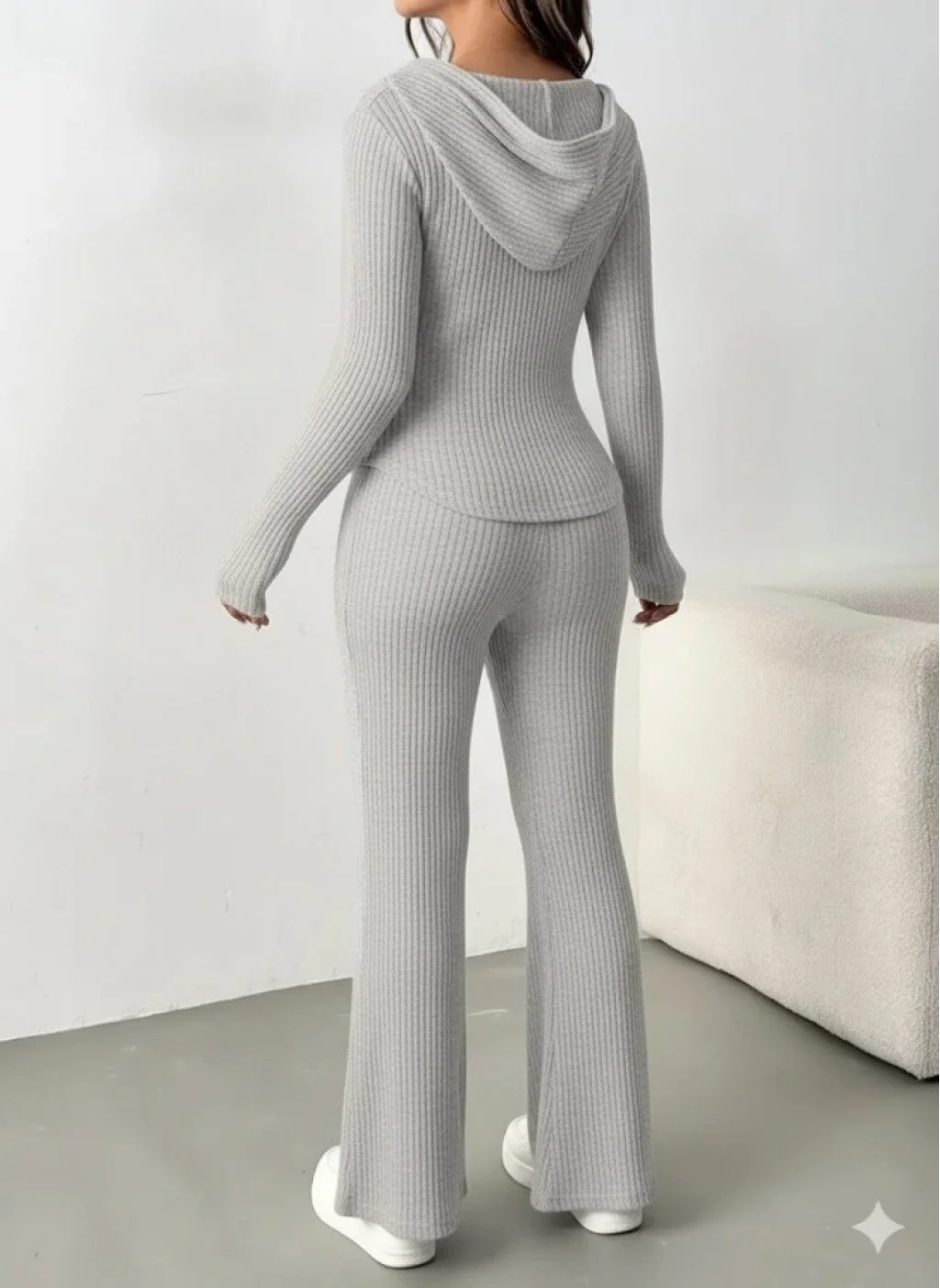 Kadın Uzun Kollu Kapşonlu önden Fermuarlı Kaşkorse Bluz Ve Pantolon Ikili Takım