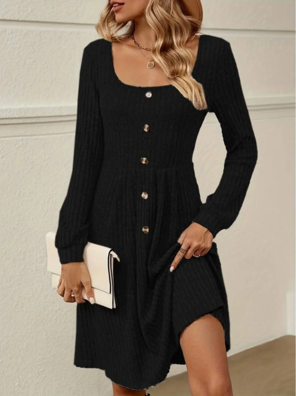 Kadın Uzun Kollu Kare Yaka önden Düğmeli Midi şardonlu Kaşkorse Elbise