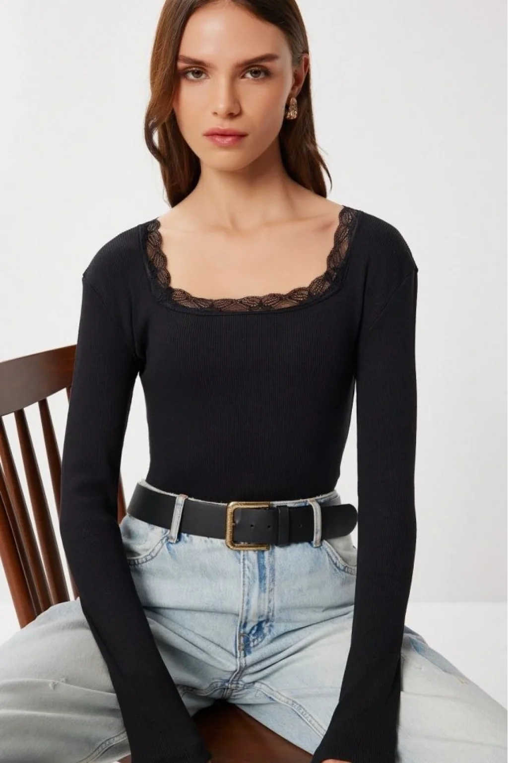 Kadın Uzun Kollu Kare Yaka Tül Detay Kaşkorse Kumaş Bluz