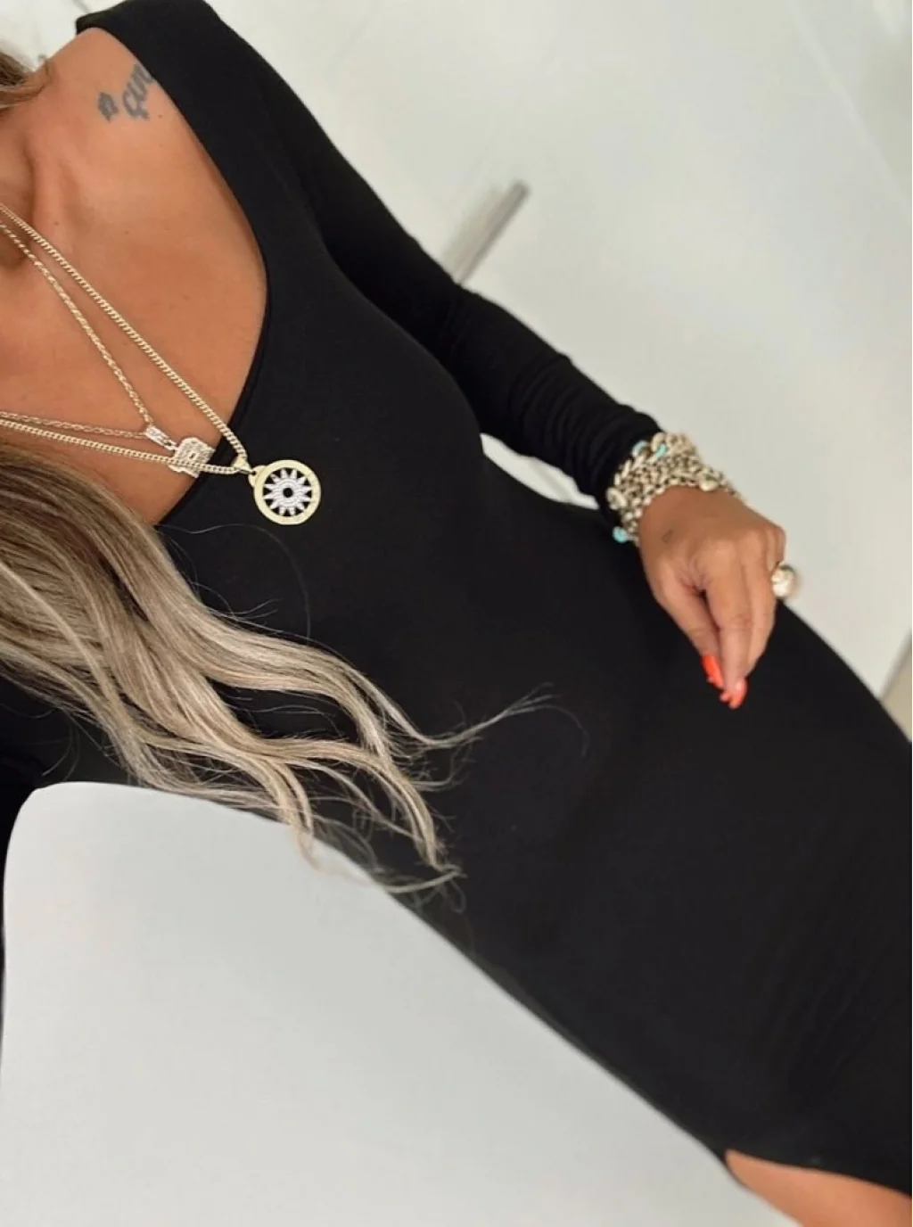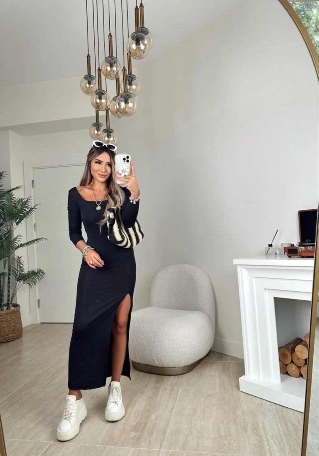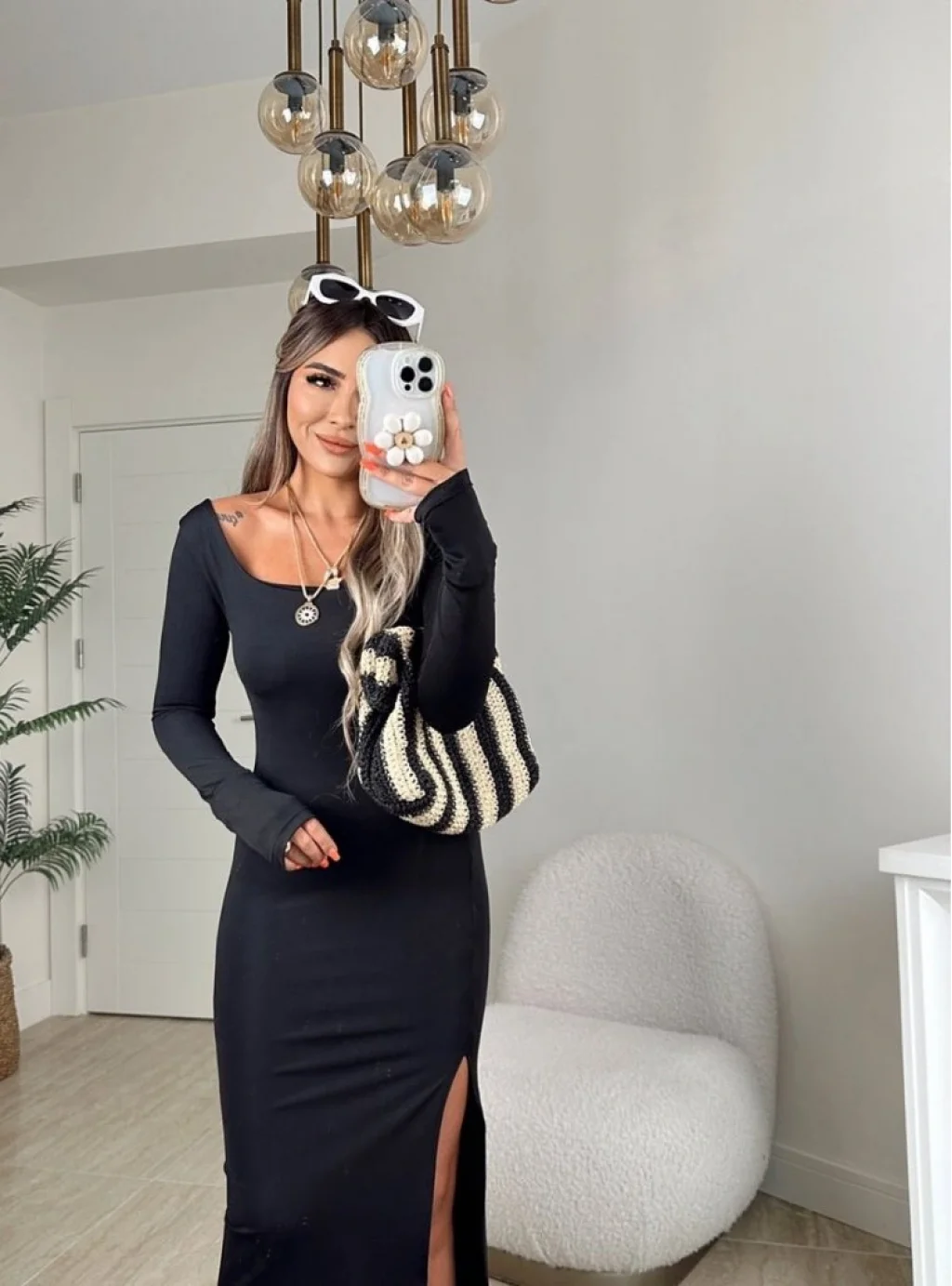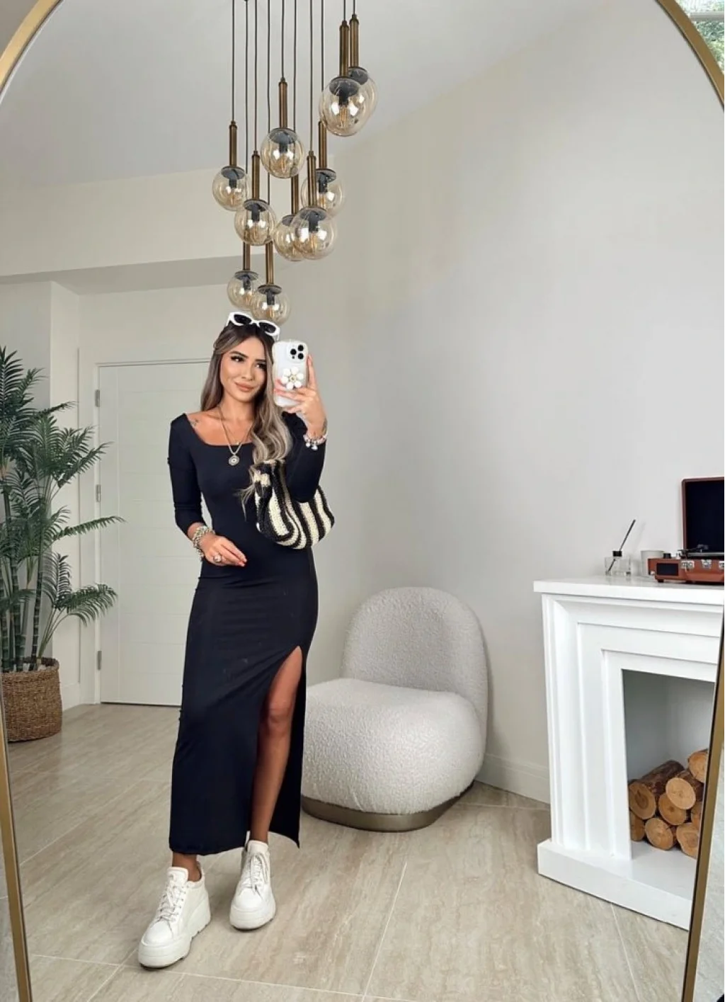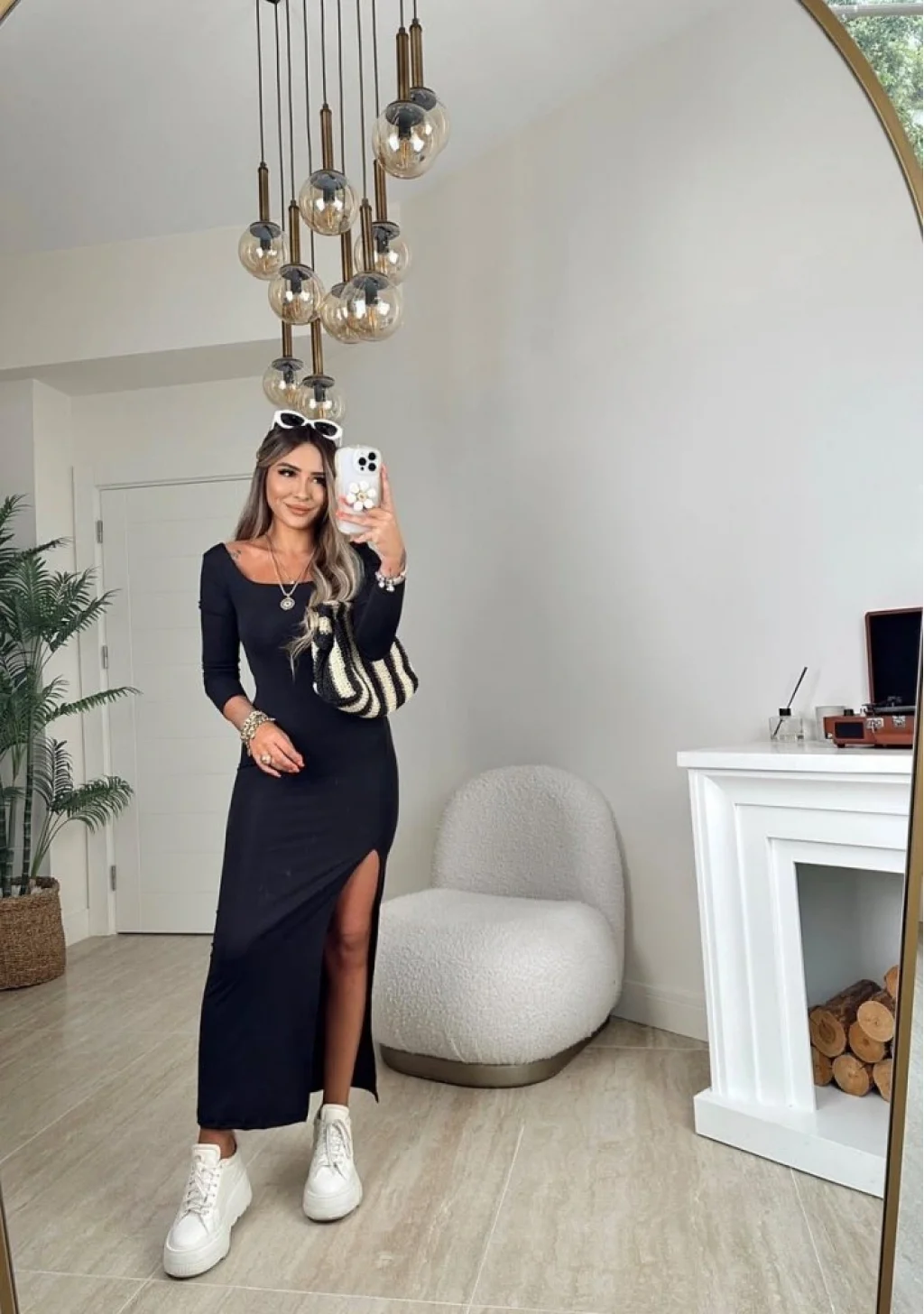 Kadın Uzun Kollu Kare Yaka Yanda Derin Yırtmaçlı Sandy Tam Boy Elbise