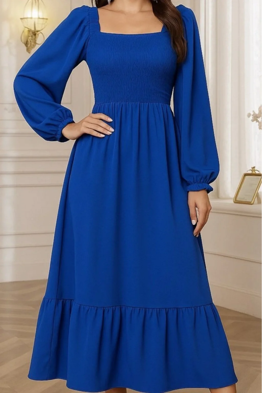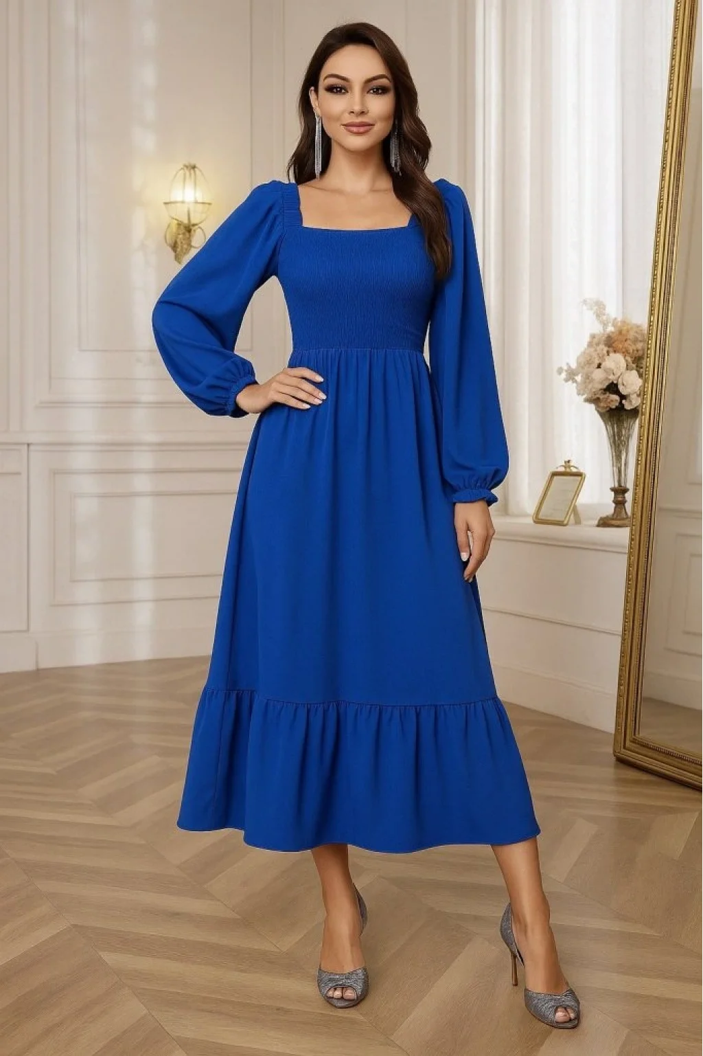 Kadın Uzun Kollu Kare Yakalı Gipeli Uzun Trikoton Elbise