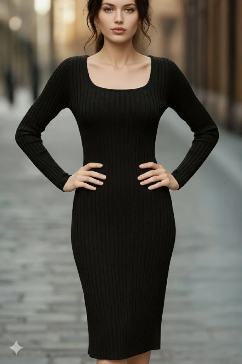 Kadın Uzun Kollu Kare Yakalı Midi şardonlu Kaşkorse Elbise