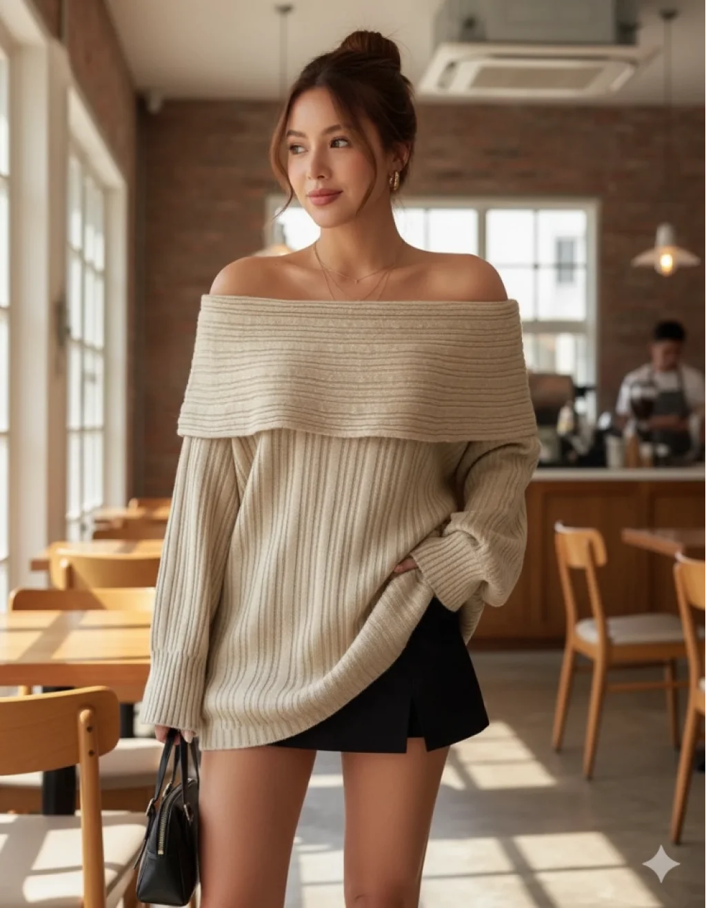 Kadın Uzun Kollu Katlama Detay Madonna Yaka Salaş Kazak