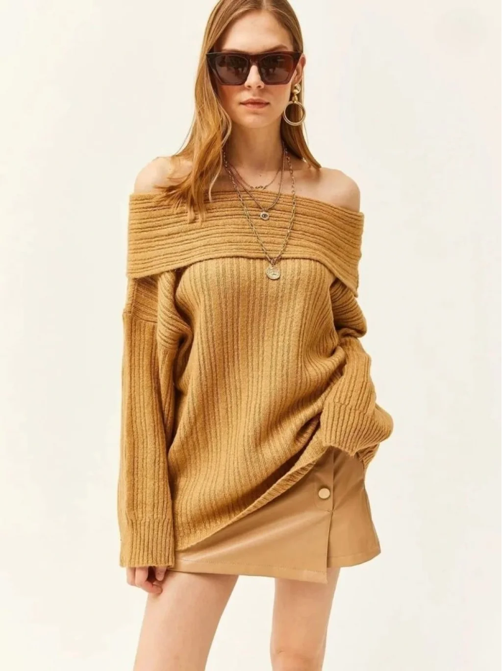 Kadın Uzun Kollu Katlama Detay Madonna Yaka Salaş Kazak