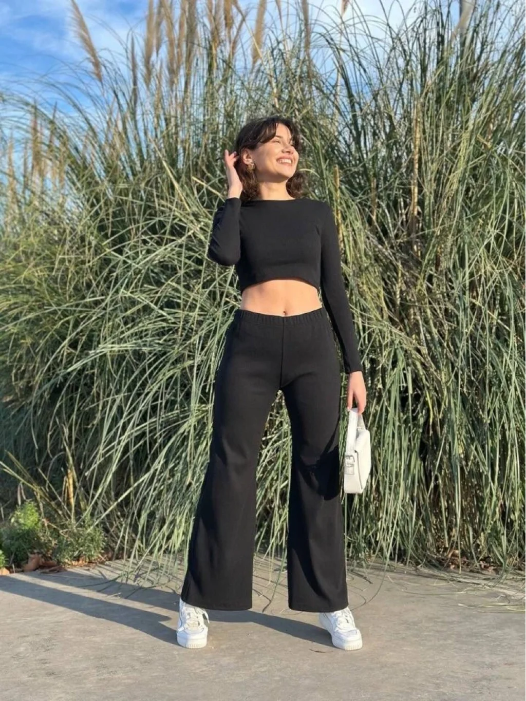 Kadın Uzun Kollu Kayık Yaka Kıza Bluz Ve Bol Paça Pantolon Ikili Takım