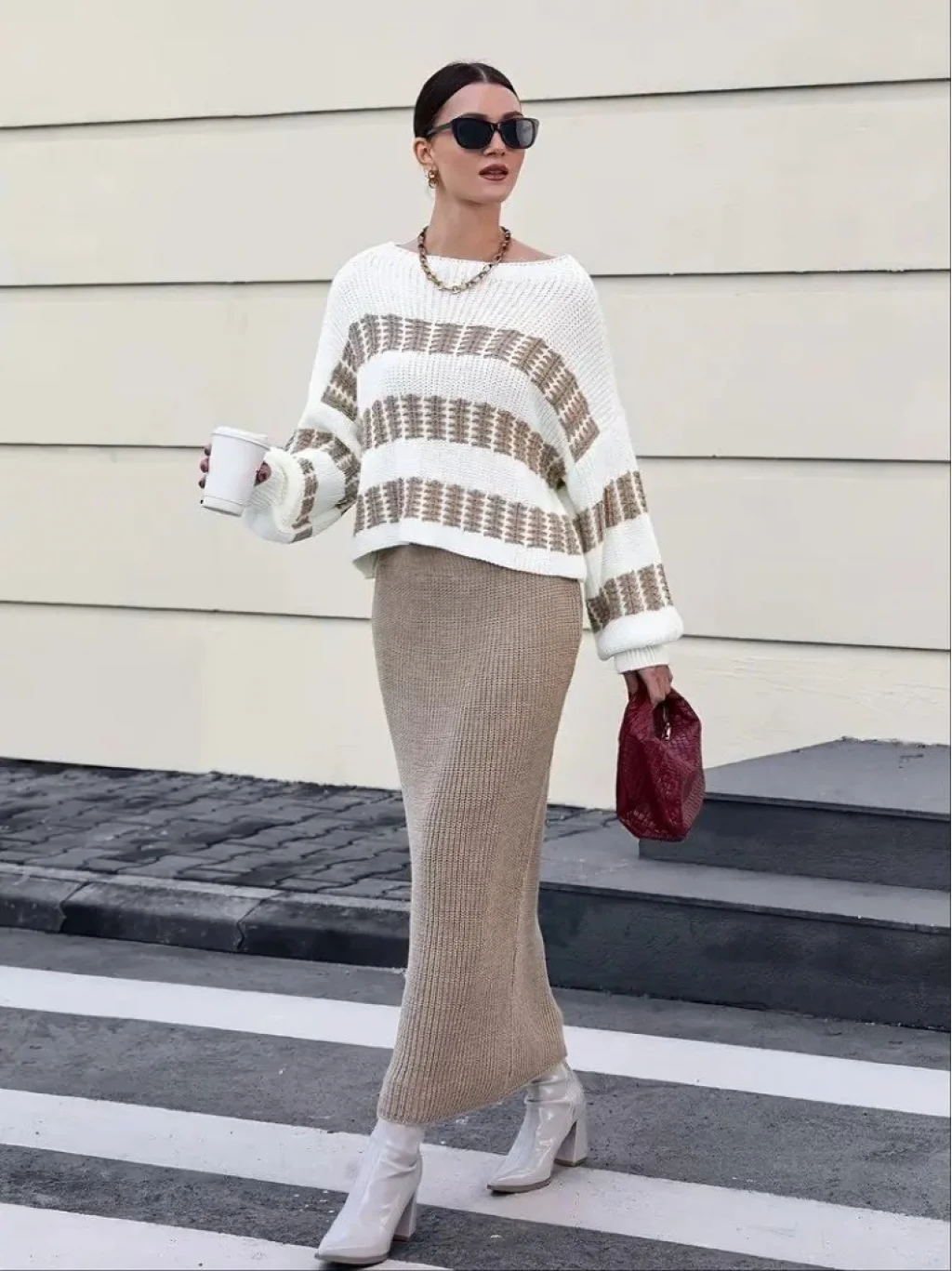 Kadın Uzun Kollu Kayık Yakalı Salaş Triko Bluz Ve Etek Ikili Takım