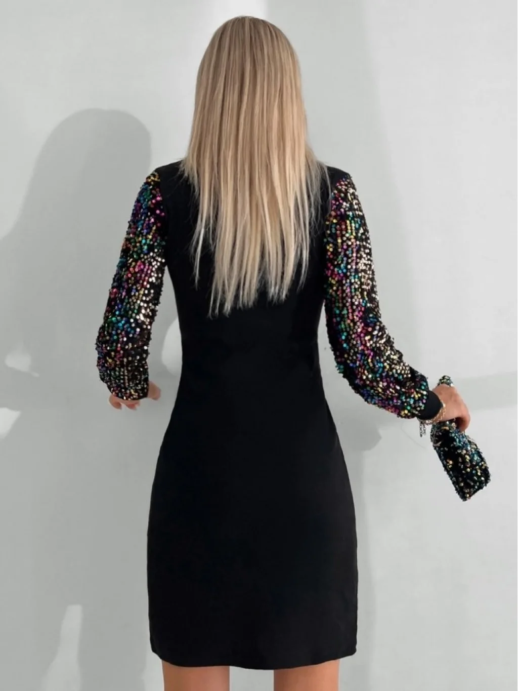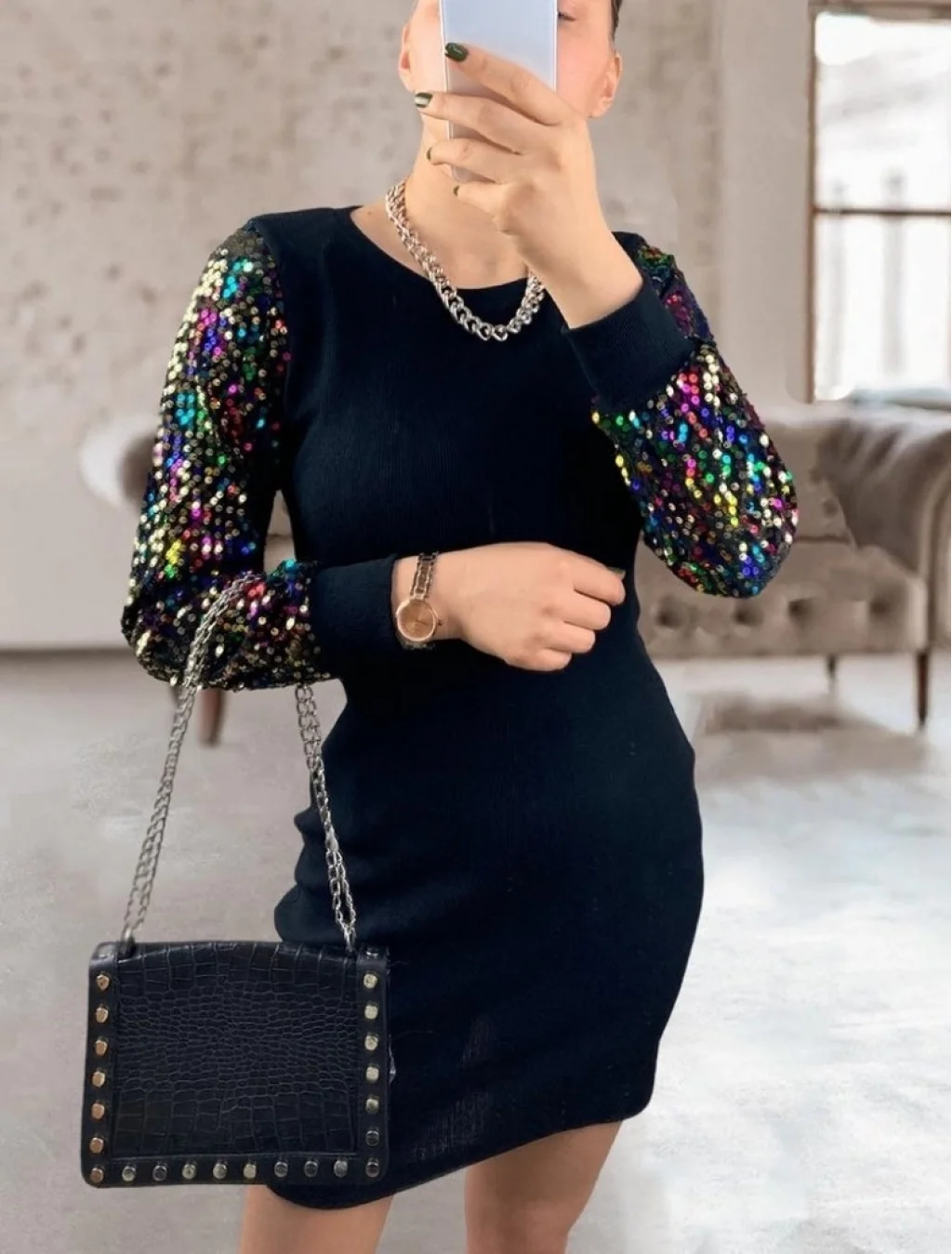 Kadın Uzun Kollu Kolları Payet Bisiklet Yaka Kısa Kaşkorse Elbise