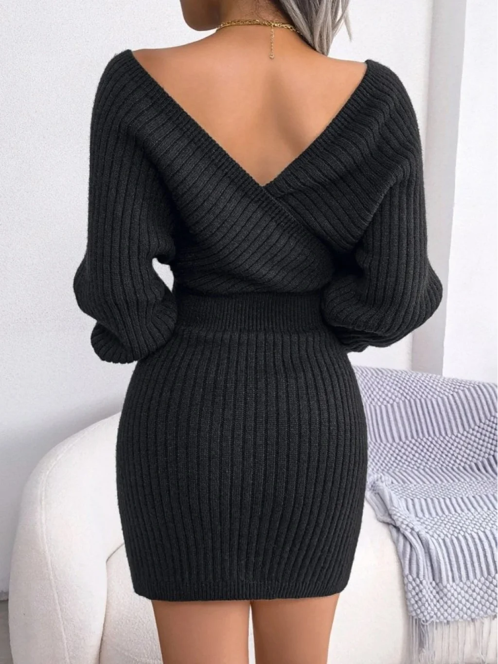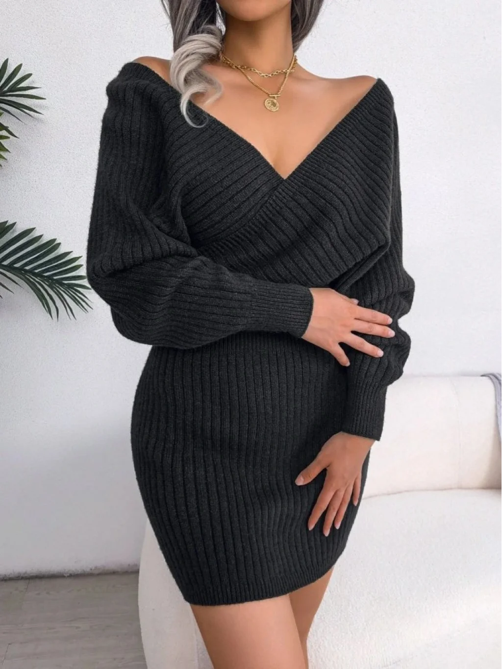 Kadın Uzun Kollu Kruvaze Geniş Yakalı Mini Triko Elbise