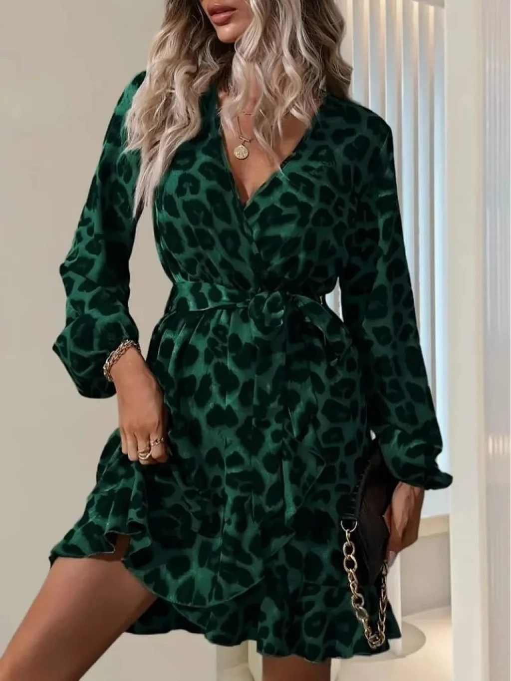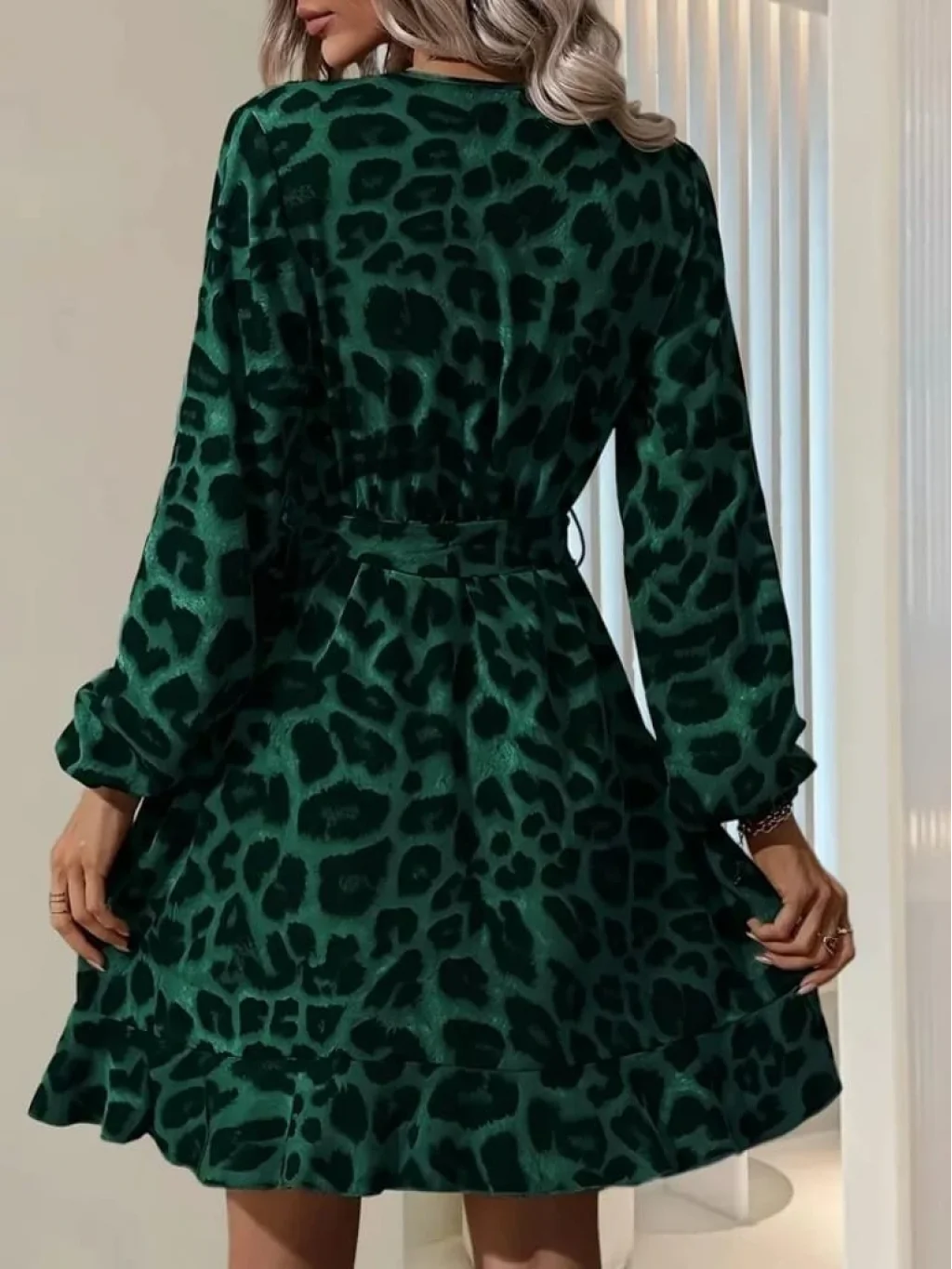 Kadın Uzun Kollu Kruvaze Yaka Beden Kuşaklı çapraz Kesim Detaylı Leopar Modal Mini Elbise