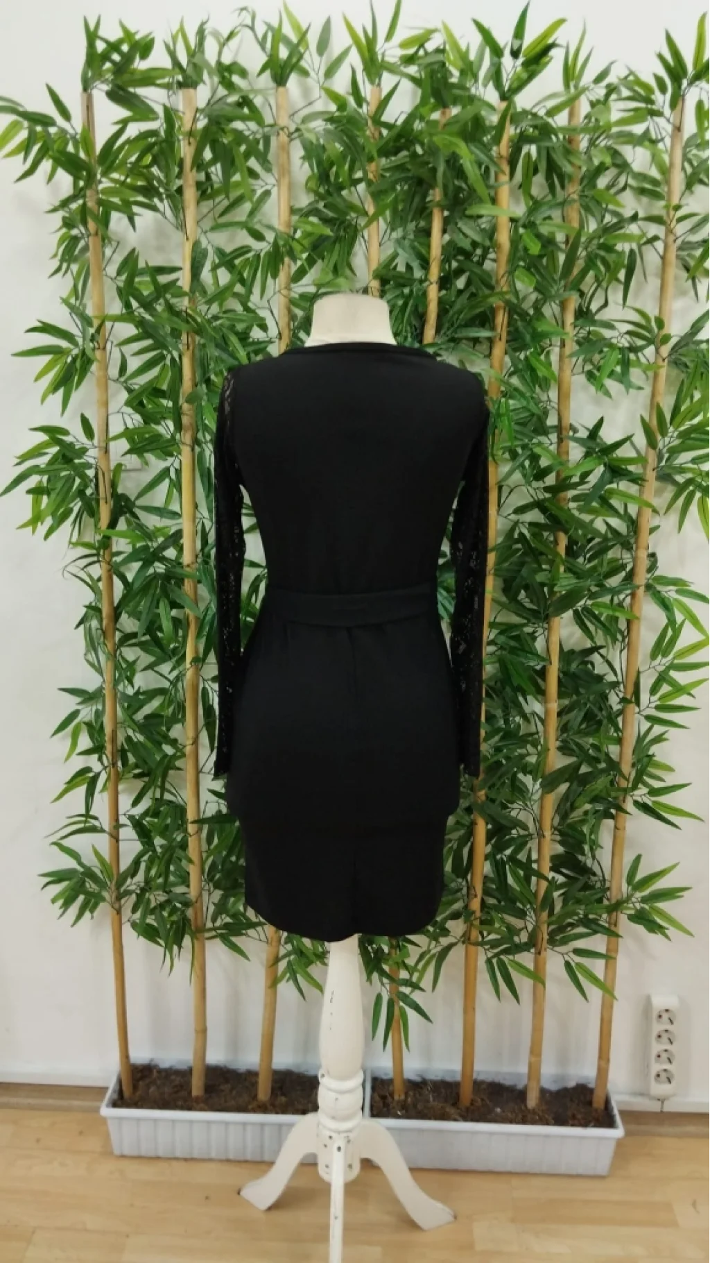 Kadın Uzun Kollu Kruvaze Yaka Belden Kuşaklı Dantel Detaylı Kısa Ithal Krep Elbise